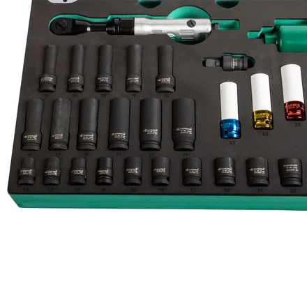 Набор головок. Ударные головки изготовлены из высокопрочного хром-молибденового сплава (CrMo), что гарантирует устойчивость к ударным нагрузкам. Специальное фосфатное покрытие защищает от загрязнений и высоких температур. Головки для литых дисков дополнительно защищены пластиковыми чехлами. Цветовая маркировка облегчает поиск нужного размера.