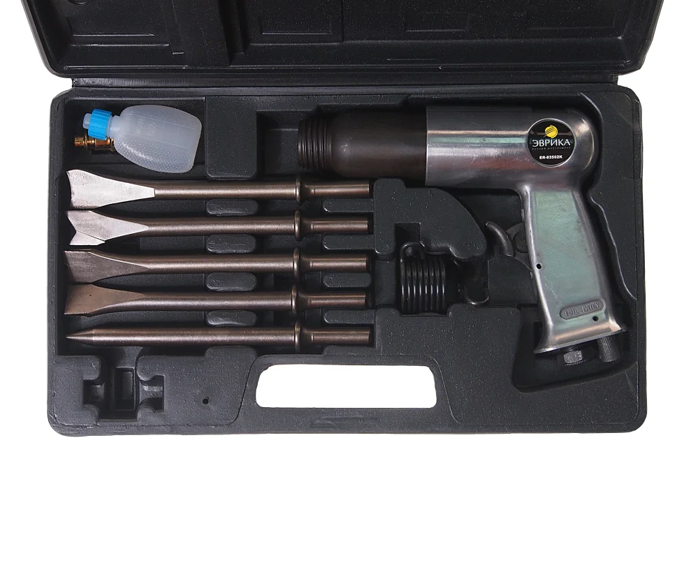 Молоток пневматический в комплекте с 5-ю зубилами разных видов. Предназначен для выполнения ударных, режущих и рубящих работ, например, удаления заклепок,снятия слоя старого покрытия или штробления. Частота ударов молотка составляет 4 000 уд/мин. Рабочий ход 57 мм. Энергия удара 7,2 Дж. Хвостовик ROUND (0.401"/10,2 мм). Длина молотка 185 мм