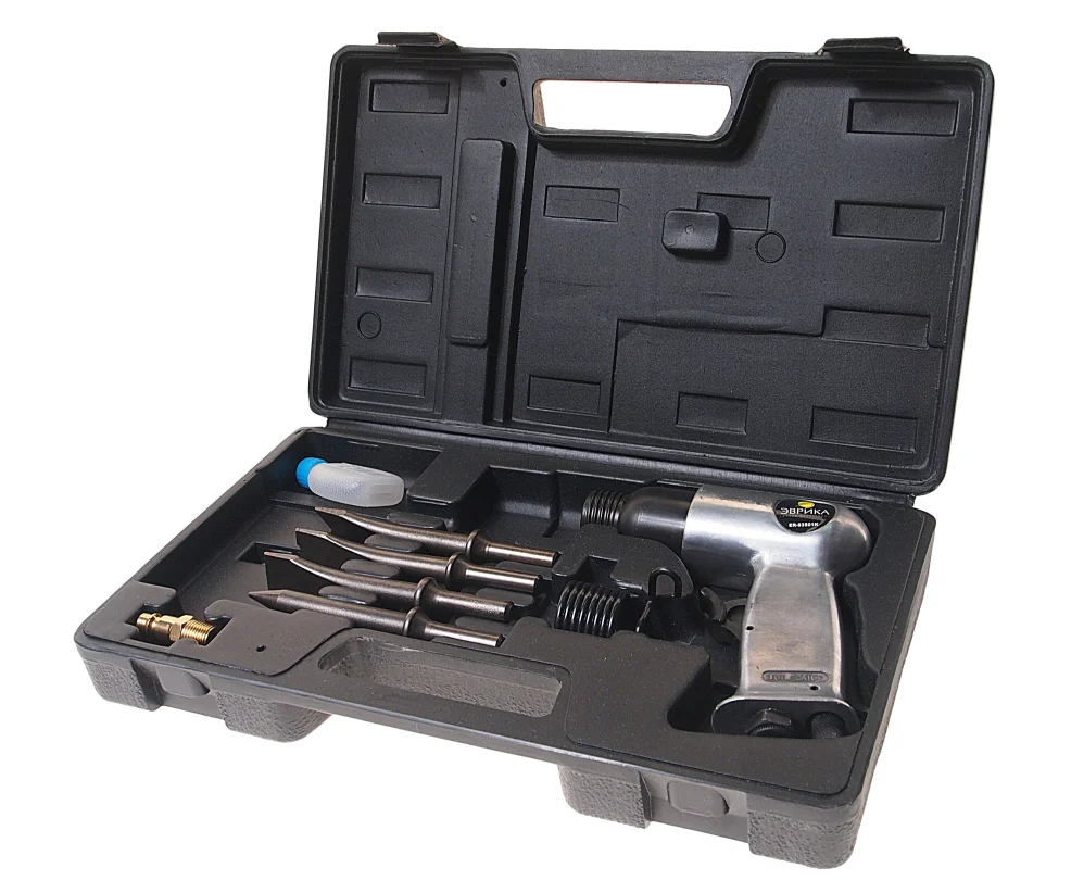 Пневмомолоток 1/4" 4500 уд/мин с набором зубил ЭВРИКА. Наша компания предлагает широкий ассортимент пневмоинструментов, среди них пневмо молоток(пневмозубило). Этот инструмент станет незаменимым помощником при работе с металлом. Кроме того, он станет отличным подарком, радуя как дедушку, так и сына, мужа, дядю и брата. Пневмозубило комплектуется четырьмя зубилами с круглым хвостовиком, замена которых осуществляется легко и быстро. Металлический корпус устойчив к царапинам и сколам, поэтому инструмент имеет долгий срок службы. Кейс защищает набор при транспортировке и решает проблему хранения. Технические характеристики: штуцер для подключения воздушного шланга: 1/4". частота ударов: 4 500 уд/мин. давление воздуха в пневмолинии рекомендованное: 6.2 бар. расход воздуха: 100 л/мин. диаметр шланга внутренний: 10 мм. длина зубила: 125 мм. Комплектация: пневмомолоток; пружина возвратная; штуцер 1/4" «папа»; масленка; зубила – 4 шт.(остроконечное; для рубки металла; плоское с просечкой - 2 шт.) Наша компания предлагает только качественные пневмоинструменты, которые имеют длительный срок эксплуатации и отличную производительность. Выбирайте нашу продукцию и получите отличный инструмент для работы с металлом!
