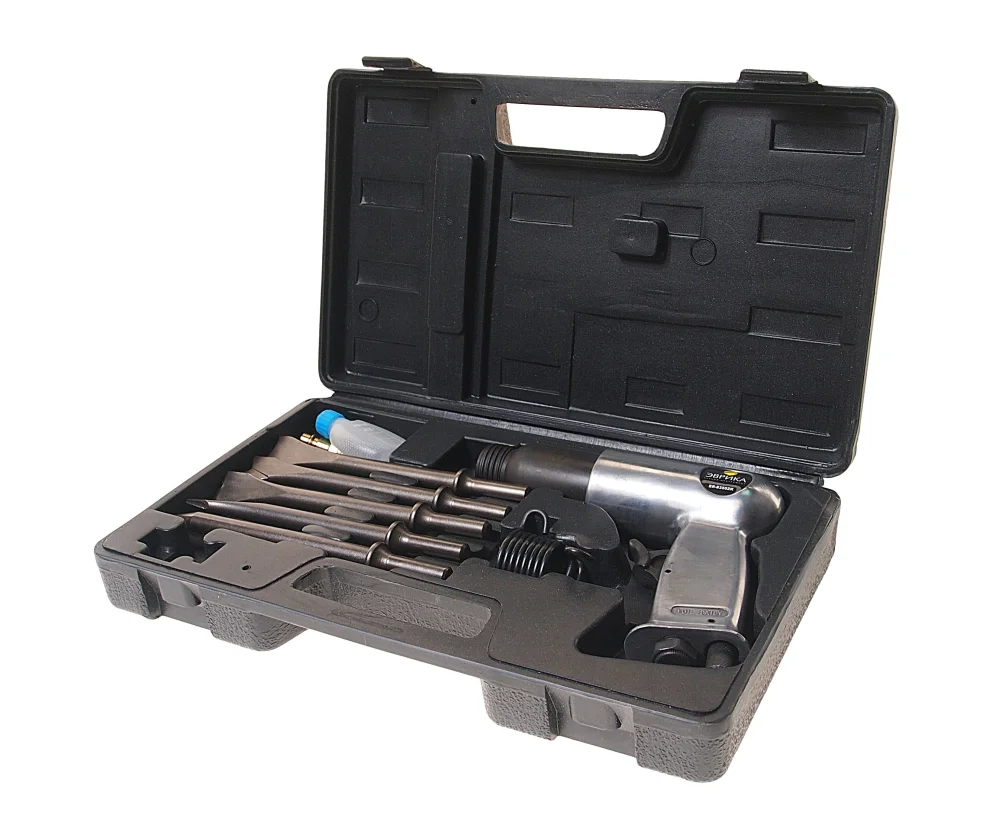 Пневмомолоток 1/4" 3000 уд/мин с набором зубил ЭВРИКА 9 предметов используется при демонтаже различных конструкций. Инструмент комплектуется пятью зубилами с круглым хвостовиком, замена которых осуществляется легко и быстро. Цельнометаллический корпус имеет долгий срок службы. Кейс защищает набор при транспортировке и решает проблему хранения. А так же, пневмомолоток станет отличным подарком папе, мужу, брату, дяде! Технические характеристики: Тип инструмента: зубило Тип хвостовика: цилиндрический Расход воздуха: 150 л/мин Давление: 6.2 атм Частота ударов: 3000 уд/мин Упаковка: кейс/чемодан Вес: 2.662 кг Преимущества: 1.Устойчивость к перегрузкам и перегреву. 2.Возможность длительной работы ЭВРИКА ER-83502K без остановки. 3.Низкая взрыво- и пожароопасность рабочего процесса. 4.Кейс для защиты при транспортировке. 5.Чувствительный курок для удобного нажатия практически при любом хвате инструмента.