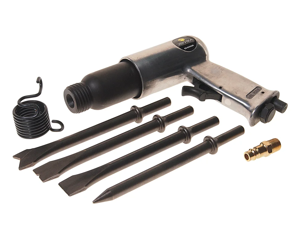 Пневмомолоток 1/4" 3000 уд/мин с набором зубил ЭВРИКА наша компания предлагает широкий ассортимент пневмоинструментов, среди них пневмо молоток(пневмозубило). Этот инструмент станет незаменимым помощником при работе с металлом. Кроме того, он станет отличным подарком, радуя как дедушку, так и сына, мужа, дядю и брата. Технические характеристики: штуцер для подключения воздушного шланга: 1/4″. частота ударов: 3 000 уд/мин. давление воздуха в пневмолинии рекомендованное: 6.2 бар. расход воздуха: 150 л/мин. диаметр шланга внутренний: 10 мм. длина зубила: 173 мм. Комплектация: пневмомолоток; пружина возвратная; остроконечное зубило(пика); плоское зубило; плоское зубило с просечкой для срезки заклёпок — 2 шт.; штуцер подключения к пневмолинии 1/4″ «папа» — 1шт. Наша компания предлагает только качественные пневмоинструменты, которые имеют длительный срок эксплуатации и отличную производительность. Выбирайте нашу продукцию и получите отличный инструмент для работы с металлом!