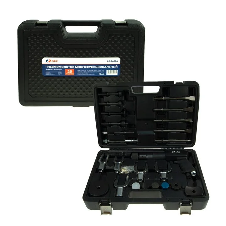 "ПНЕВМОМОЛОТОК МНОГОФУНКЦИОНАЛЬНЫЙ 25ПР ВЕС: 8.55кг. Размер кейса: 445 × 310 × 115мм. Материал: 40Cr Используется для снятия шаровых опор, сепараторов шариков, тормозных дисков, ослабления алюминиевых деталей, разделительных пластин, вибрации для снятия всех видов автомобильных винтов, ослабления полуосей, тормозных дисков и т. д. Состав: 1 Пневматический молоток 2 Съемник шаровых шарниров открытого типа 18 мм 3 Съемник шаровых шарниров открытого типа 24,5 мм 4 Съемник шаровых шарниров открытого типа 29 мм 5 Круглая нажимная пластина 38 мм 6 Вогнутая нажимная пластина 63 мм 7 Переходная втулка 8 Переходная втулка 9 Переходная втулка 10 Переходная втулка 11 Круглая нажимная пластина 74 мм 12 Соединительный стержень адаптера 13 Круглый пневматический соединител 14 Острая лопата 15 Плоская лопата 16 Плоская лопата 17 Плоская лопата 18 Плоская лопата 19 Адаптер 20 Круглый вибрационный молот 21 Вогнутый молот 22 Вставной штифт 23 Пневматическая нажимная пластина молота 24 35-миллиметровый съемник шаровых шарниров вилочного типа с открытым концом 25 42-миллиметровый съемник шаровых шарниров вилочного типа с открытым концом"