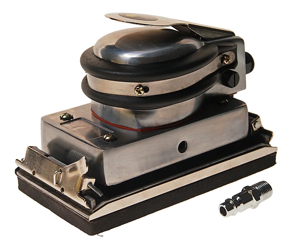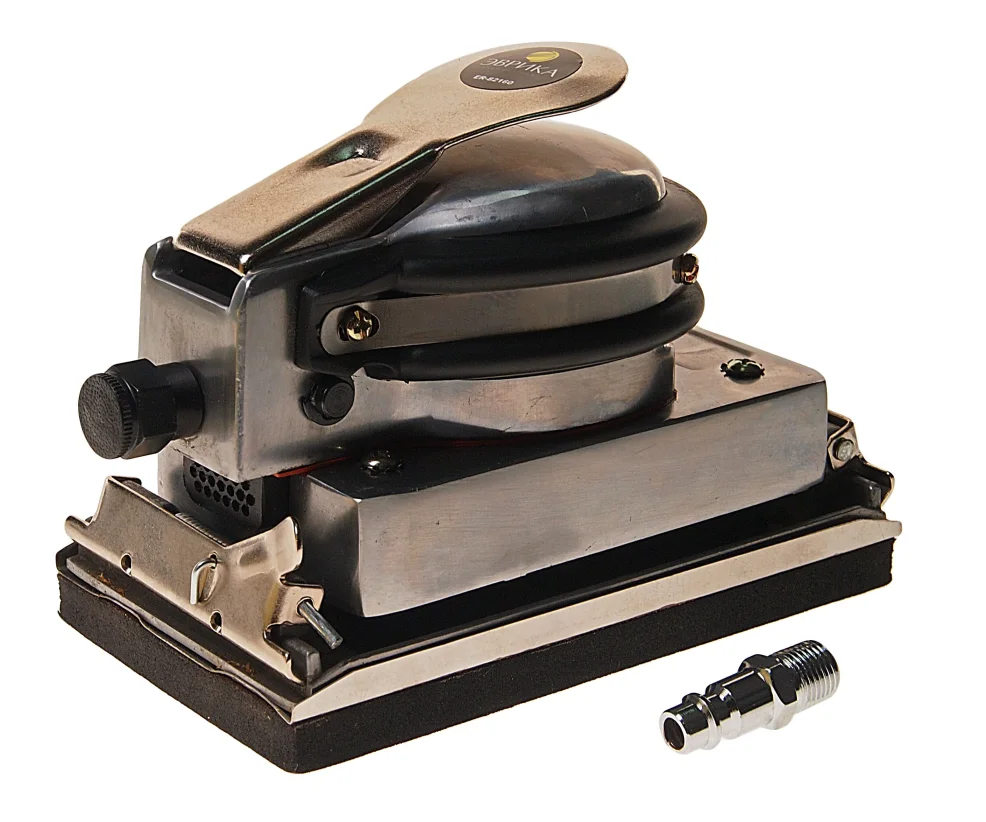 Пневмошлифмашинка с зажимной платформой 175х95мм предназначена для снятия верхнего слоя с различных поверхностей. Корпус изготовлен из металла и обеспечивает надежную защиту внутренних узлов от механических повреждений. Шлифлист надежно крепится к подошве с помощью специальных зажимов. Работа на сжатом воздухе обеспечивает больший рабочий ресурс по сравнению с электроинструментом.
