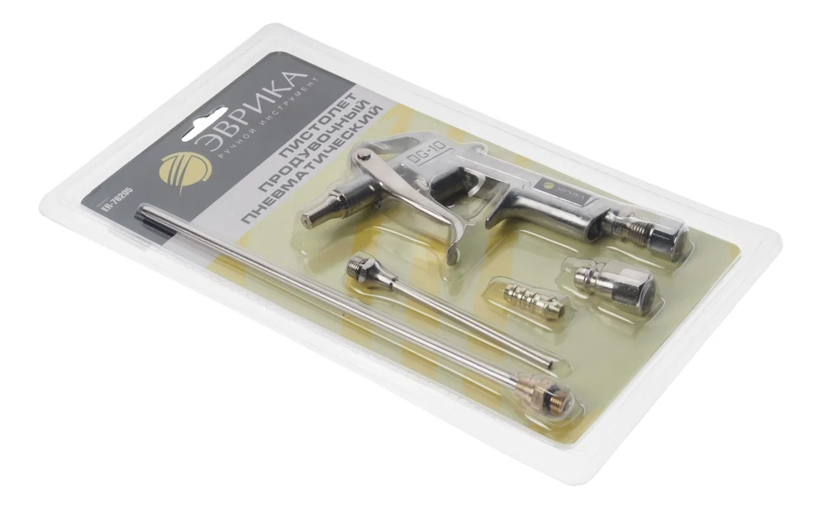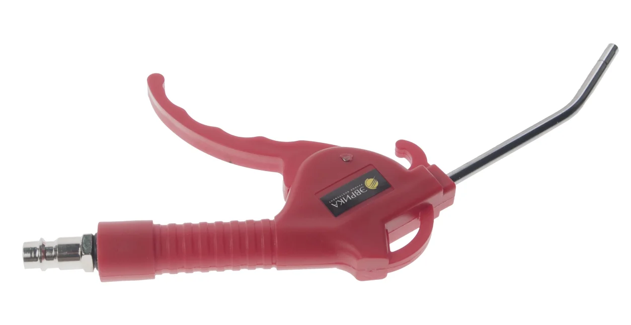 Продувочный пистолет — это пневматический инструмент, оснащённый насадками трёх размеров: 2,5, 5 и 9,5 см. Он работает с максимальным давлением 6 атмосфер и потребляет 145 литров воздуха в минуту. В комплект входят быстроразъёмный и «ёлочный» переходники. Этот пистолет предназначен для очистки загрязнённых поверхностей с помощью струи сжатого воздуха. Удлинённый носик позволяет легко добраться до труднодоступных мест. Металлический корпус устойчив к ударам и механическим повреждениям. Специальная петля обеспечивает удобное хранение инструмента в подвешенном состоянии.