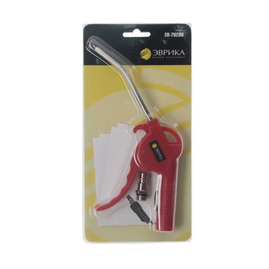 Продувочный пистолет ER-76206 пневматический( сопла 3.8мм входное отверстие 1/4 максимальное давление 6 АТМ, расход воздуха 198 л/мин.) ЭВРИКА. Продувочный пневматический пистолет ЭВРИКА ER-76206 применяется для очистки загрязненных поверхностей струей сжатого воздуха. Длинный изогнутый носик облегчает доступ в скрытые полости. Прочный пластиковый корпус устойчив к механическим повреждениям. Специальная петля дает возможность хранить инструмент в подвешенном состоянии.