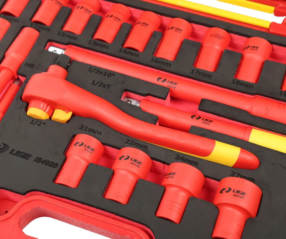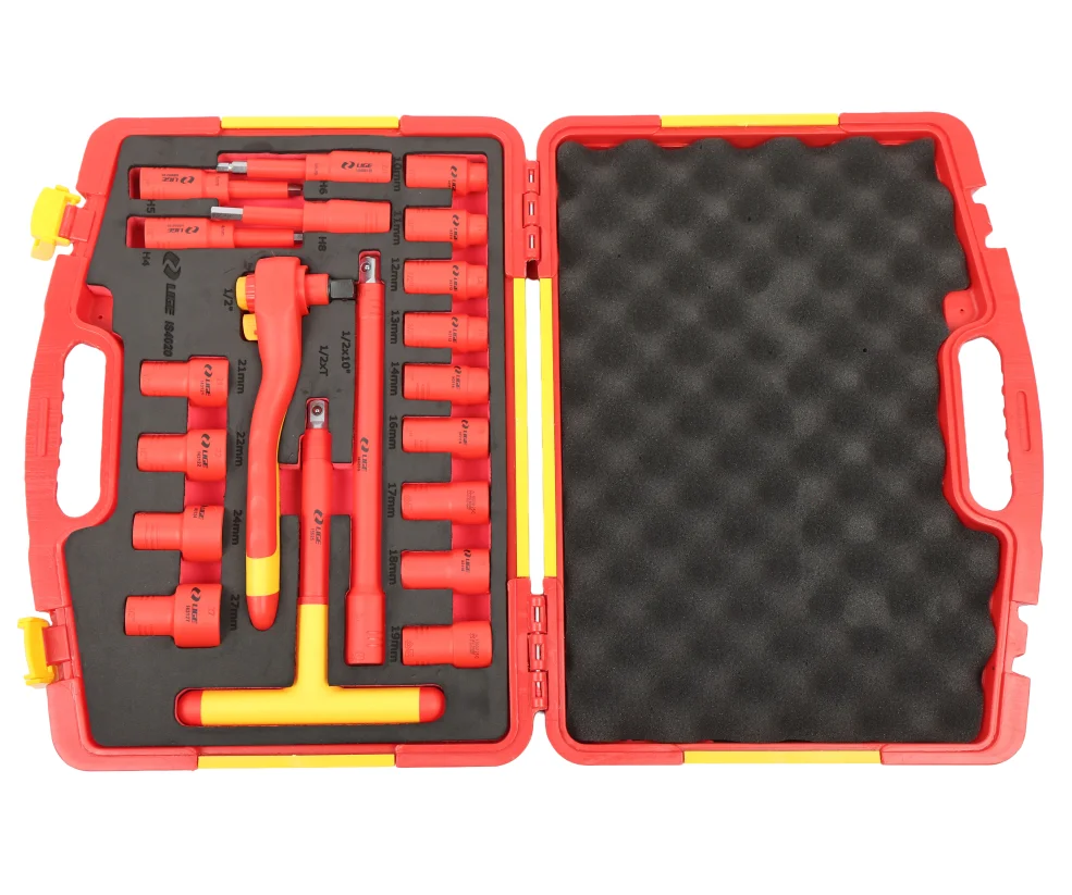 "Набор инструментов для изоляции 1/2"" 20пр. 1 шт. изолированная двухсторонняя трещотка, 1 шт. изолированный Т-образный вороток, 1 шт. изолированный утлинитель 10"" - 250мм; Удлиненные изолированные шестигранные головки : H4, H5, H6, H8 Изолированные шестигранные головки: 10, 11, 12, 13, 14, 16, 17, 18, 19, 21, 22, 24, 27 мм"