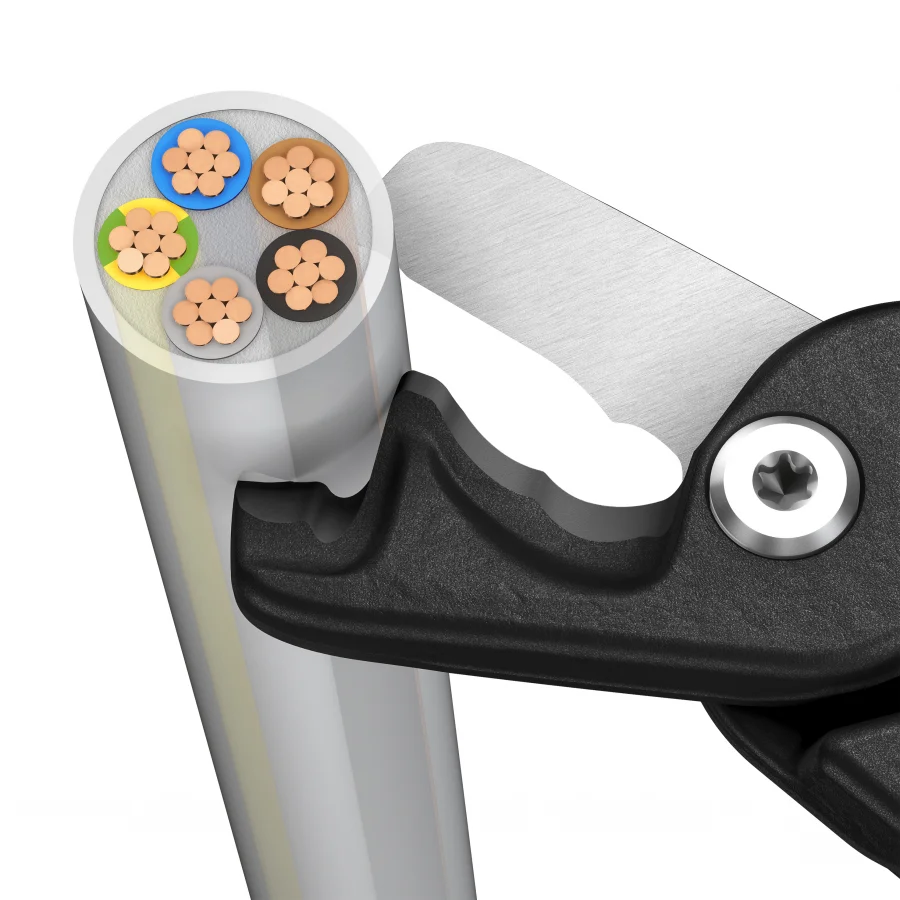 Отличная режущая способность: разрезает одножильные медные или алюминиевые кабели сечением до 35 мм², многожильные кабели сечением до 70 мм² и тонкие многожильные кабели сечением до 120 мм²