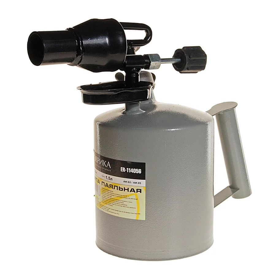 Паяльная лампа ЭВРИКА станет вашим незаменимым помощником для прогрева труб, плавления битума и других подобных работ. Благодаря удобной рукояти, удерживать инструмент будет легко и комфортно. Конструкция оснащена специальным сбором для капель горючей жидкости, что позволяет избежать возгораний во время использования. Паяльная лампа Эврика — это надежный инструмент, который станет вашим верным помощником в самых различных работах, связанных с прогревом труб и плавлением битума. Рукоятка лампы выполнена таким образом, чтобы обеспечить удобство при работе. Также в конструкции предусмотрен специальный сборник для капель горючей жидкости, который предотвращает возгорание во время использования. Технические характеристики: Пьезоподжиг: отсутствует Регулятор уровня пламени: есть Расход топлива: 800 г/ч Баллон в комплект не входит Предварительный нагрев газа: не предусмотрен Пламя имеет клиновидную форму. Топливо: бензин. Объём топлива: 1,5 л.