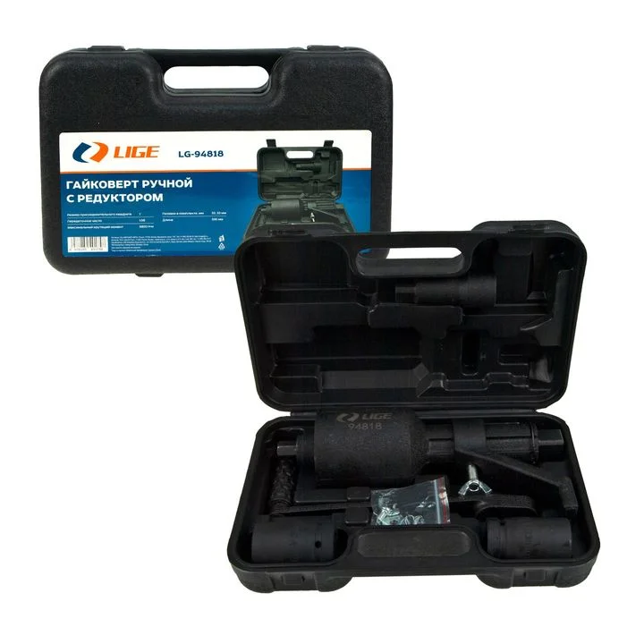 "ГАЙКОВЕРТ РУЧНОЙ С РЕДУКТОРОМ Посадочный квадрат: 1"". Комплектация: ключ-усилитель усилия ×1, торцевая головка ×2, коромысло ×1, шарнирная планка ×1. Длина ключа: 330 мм. Передаточное число: 1:58. Максимальный крутящий момент: 5800 Н·м. Характеристики торцевых головок: 32 мм, 33 мм"