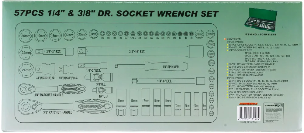Основная разновидность рабочих насадок сборного слесарно-монтажного инструмента - это торцевая головка. Торцевые головки разделяются по геометрии рабочего профиля, по длине и по назначению. Такие инструменты обеспечивают наилучшие условия для приложения рабочего усилия по сравнению с другими видами инструмента для работы с внешними рабочими профилями. Шестигранный рабочий профиль считается наилучшим с точки зрения приложения максимальных рабочих нагрузок, передаваемых крепежной детали. Набор укомплектован системами 1/4’’DR и 3/8’’DR, что позволяет работать с возможностью передачи серьезных рабочих нагрузок при компактном размере. Основная область применения инструментов этого набоаа - ремонт агрегатов автомобиля. Торцевые головки выполнены из хромованадиевой стали, имеют накатку и полуматовое хромоникелевое покрытие.
