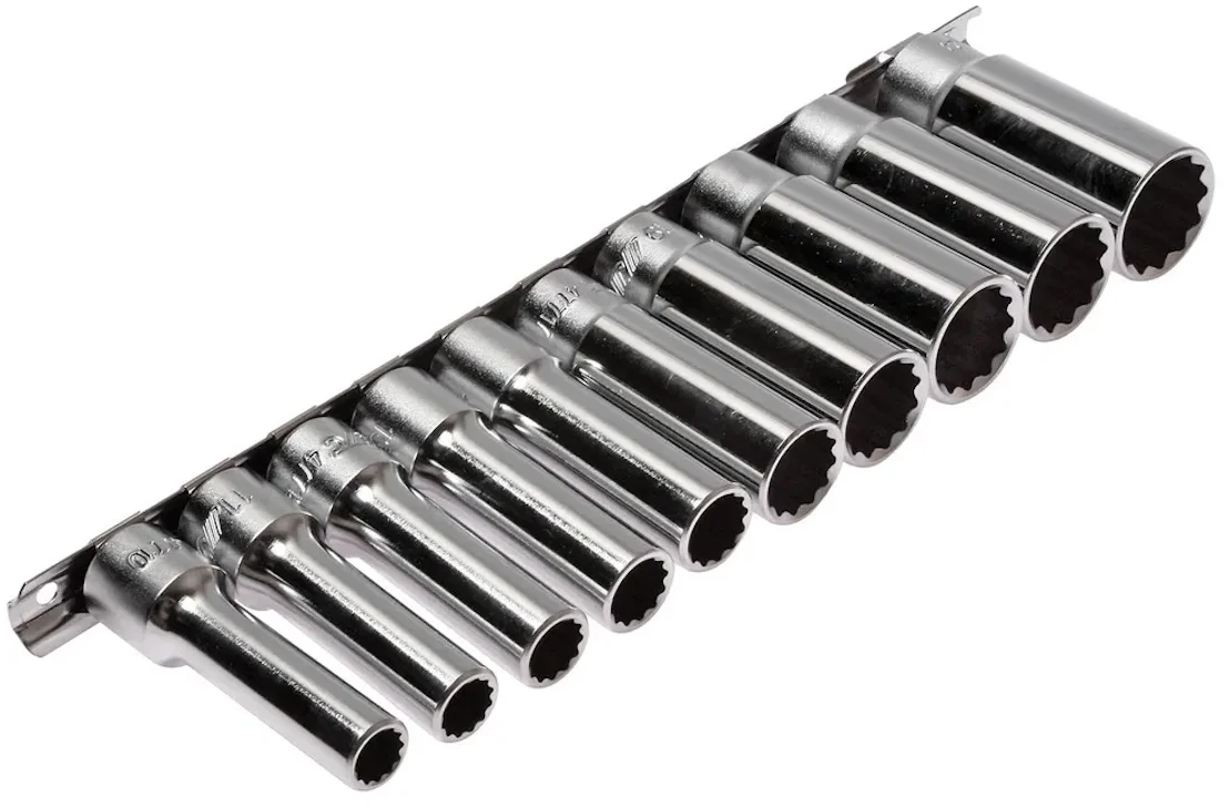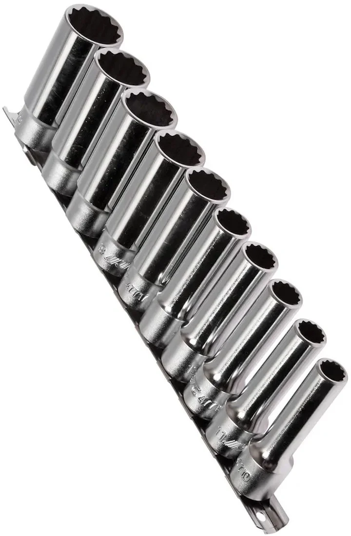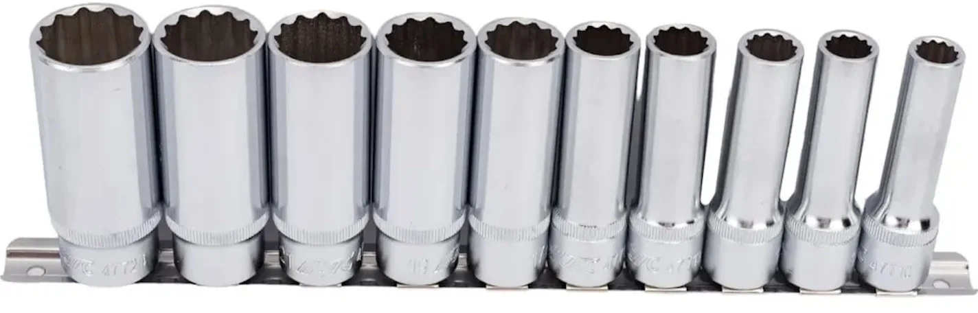 - Головки торцевые глубокие 12-ти гранные: 10, 11, 12, 13, 14, 17, 19, 21, 24 мм - 10 шт.;