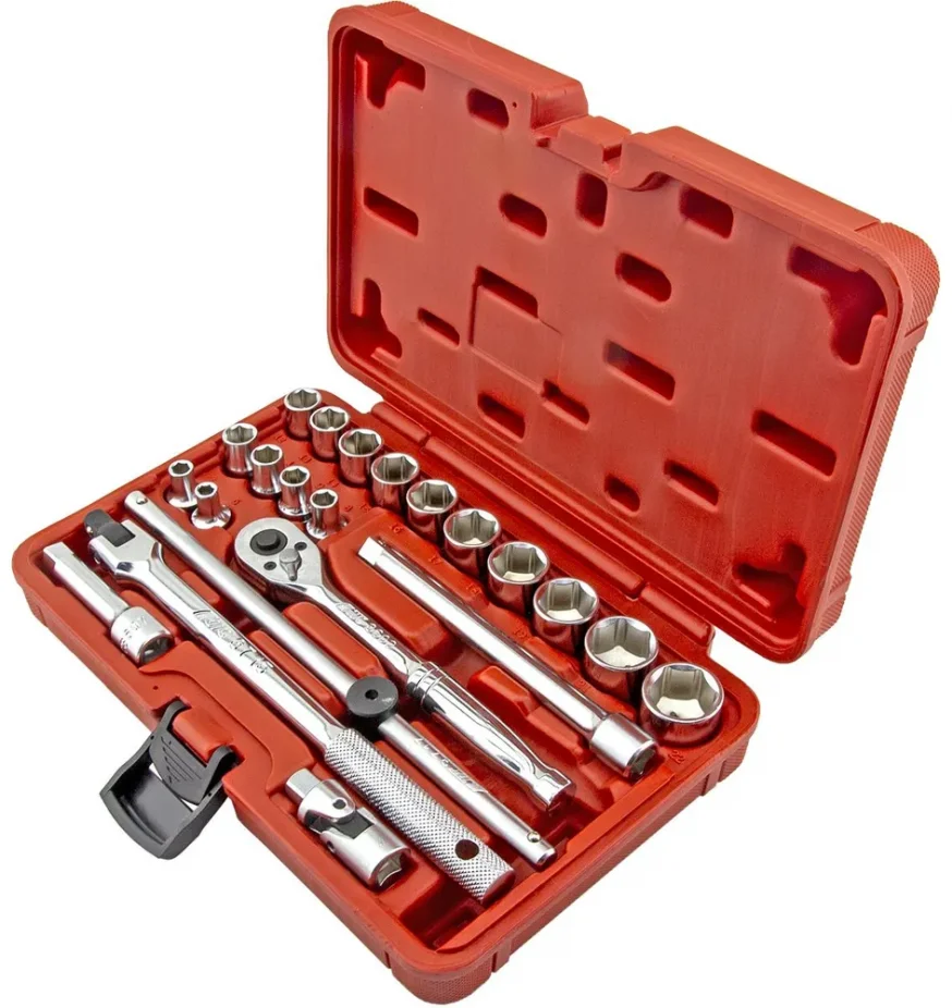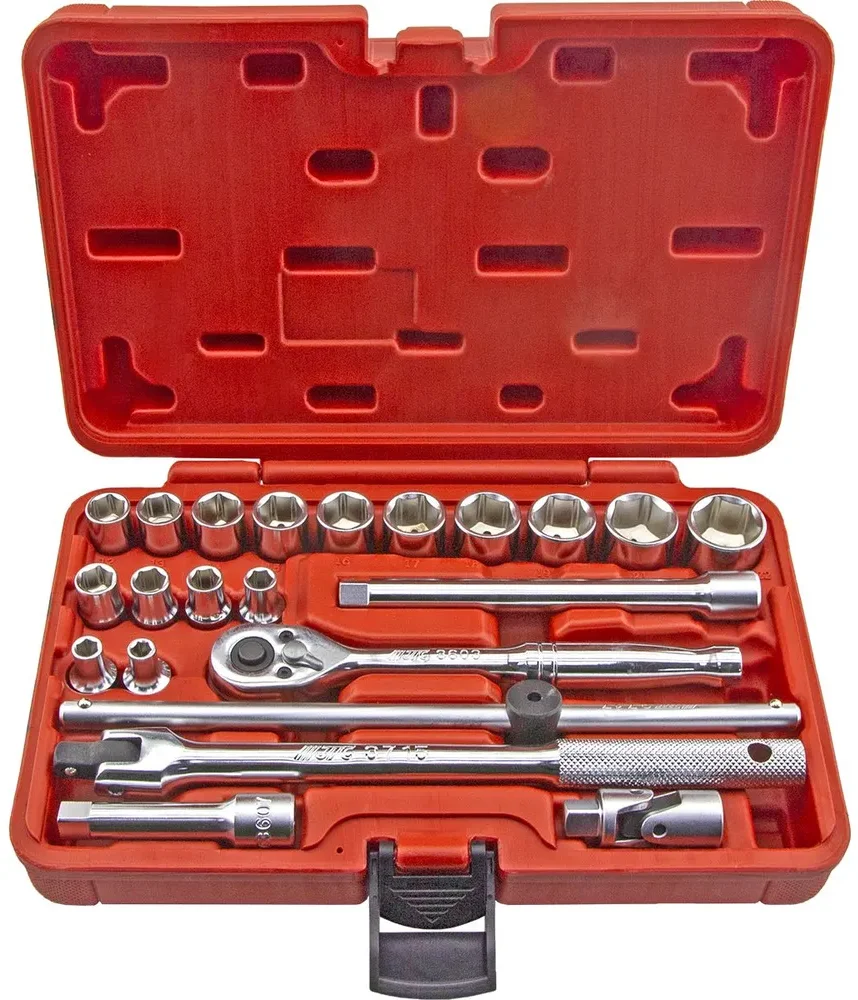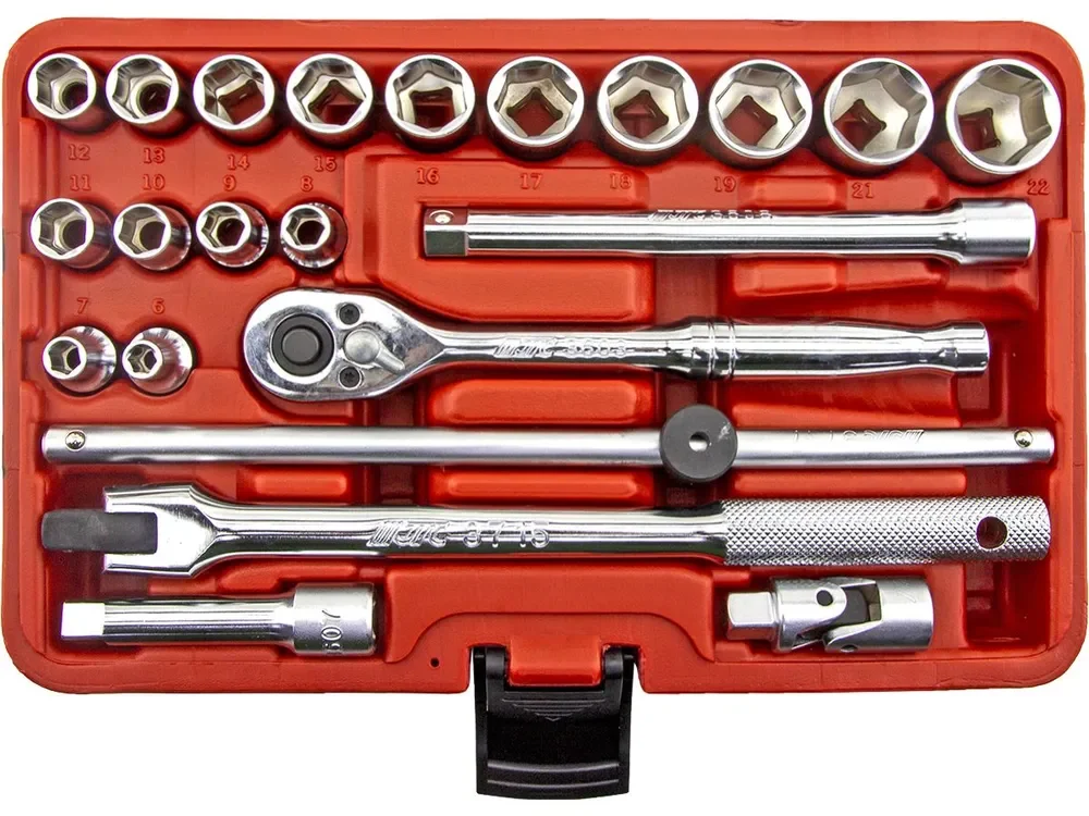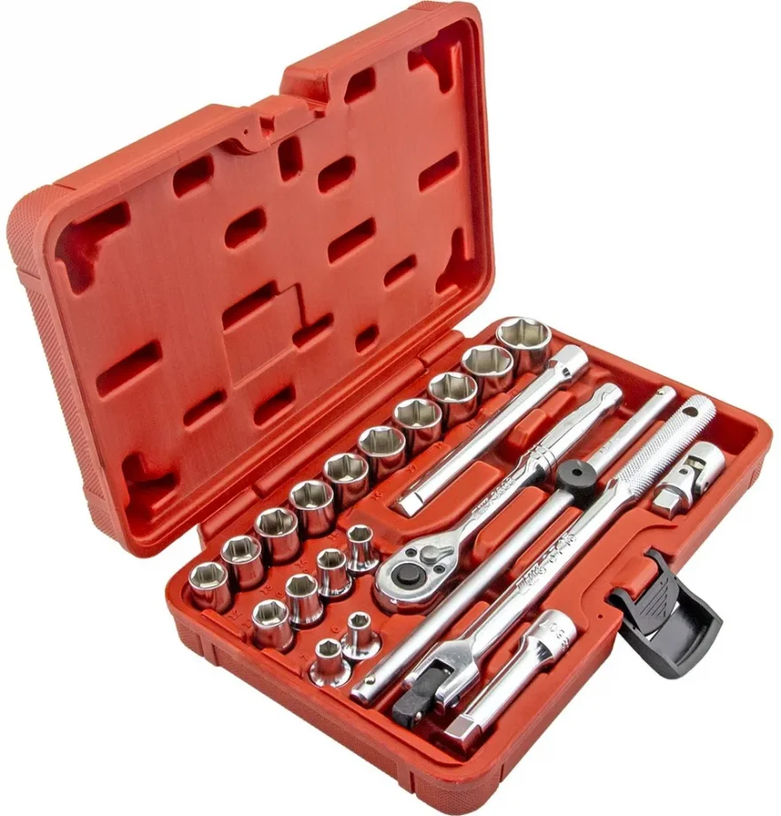 - 16 ед. головка 3/8": 6, 7, 8, 9, 10, 11, 12, 13, 14, 15, 16, 17, 18, 19, 21, 22 мм.