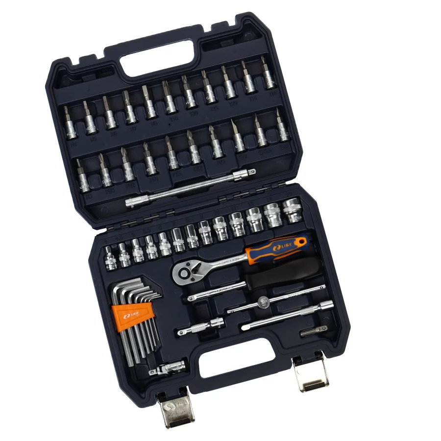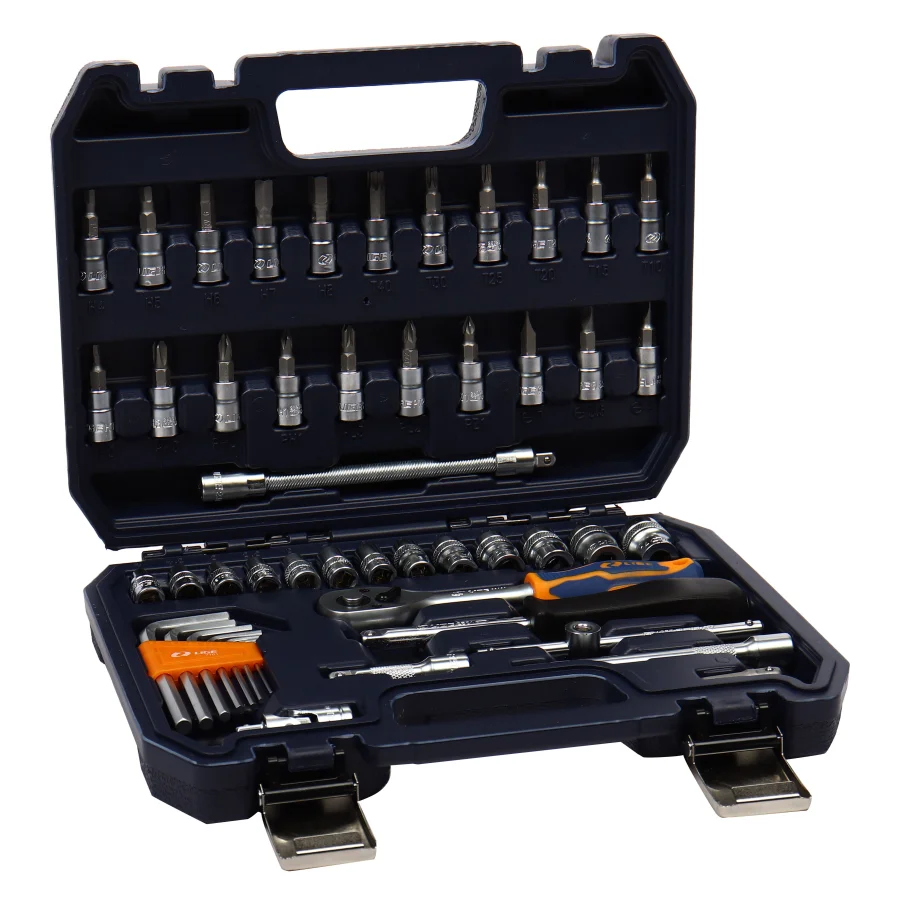 "13пр. Головки 6-гр: 4, 4.5, 5, 5.5, 6, 7, 8, 9, 10, 11, 12, 13, 14мм; 6пр. Головки-биты Hex: H3, H4, H5, H6, H7, H8; 6пр. Головки-биты TORX: T10,T15,T20,T25,T30,T40; 3пр. Головки-биты Slotted: SL4.0, SL5.5, SL7.0; 6пр. Головки-биты Phillips: PZ.1, PZ.2, PZ.3, PH.1, PH.2, PH.3; 1пр. Трещотка (72 зуб.); 1пр. Отвертка-вороток; 1пр. Вороток Т-образный; 2пр. Удлинители: 50, 100мм; 1пр. Гибкий удлинитель; 1пр. Кардан шарнирный; 1пр. Адаптер под шуруповерт: 1/4""(F)х 1/4""(F); 7пр. Ключи шестигранные Г-образные: 1.5, 2, 2.5, 3, 4, 5, 6мм. "