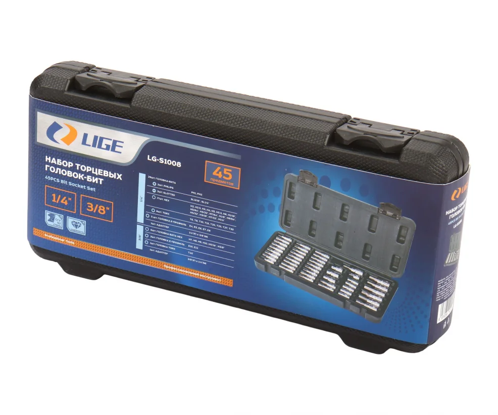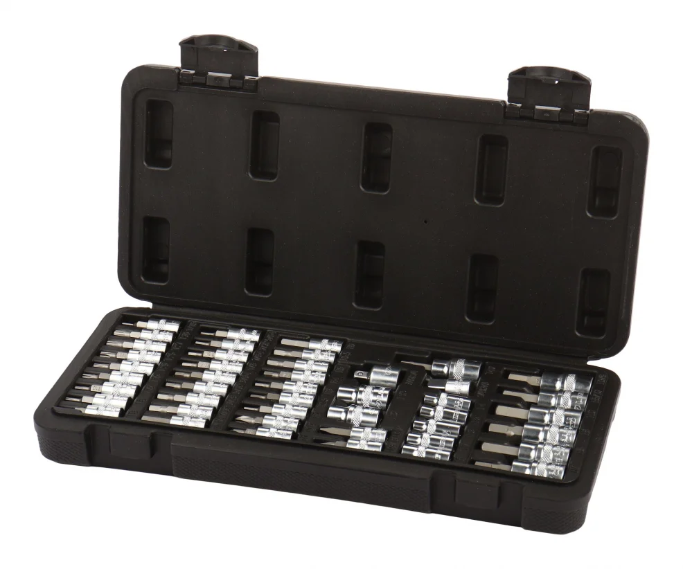 29шт, 1/4" головки-биты: PH1,2, FD3/16, 1/4, H2, 2.5, 3, 4, 5, 5.5, 6 H1/16", 5/64", 3/32", 7/64", 1/8", 9/64", 5/32", 3/16", 7/32", 1/4" T6,8,10,15,20,25,27,30 1шт, 3/8" x 1/4" AD 2шт, 3/8" E E10-12 1шт, 3/8" Torx T40 6шт, 3/8" hex H7,8,9,10, 5/16",3/8" 5шт, 1/4" E E4,5,6,7,8 1шт, 1/4" x 3/8" AD Материал: CR-V S2