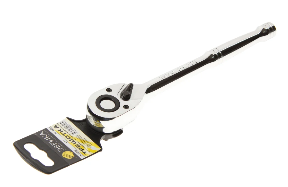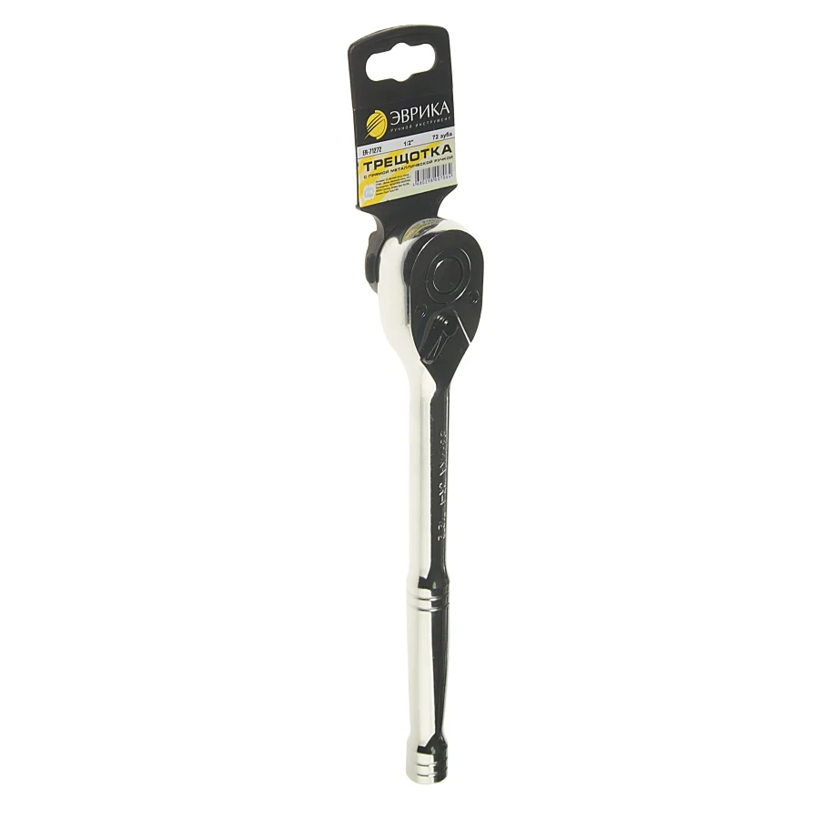 Трещотка с прямой металлической ручкой ЭВРИКА 1/2 72-зубцовая ER-71272 представляет собой удобный инструмент для монтажа и демонтажа крепежных элементов различного вида. Благодаря флажковому переключателю и кнопке быстрого сброса можно быстро сменить направление вращения или оснастку. Технические характеристики: Длина: 260 мм Трещотка: есть Покрытие: нет Материал: сталь Диэлектрическое покрытие: нет Количество зубьев: 72 шт Шарнирный механизм: нет Посадочный квадрат: 1/2 дюйма Удлинитель: нет Вид: дюймовый