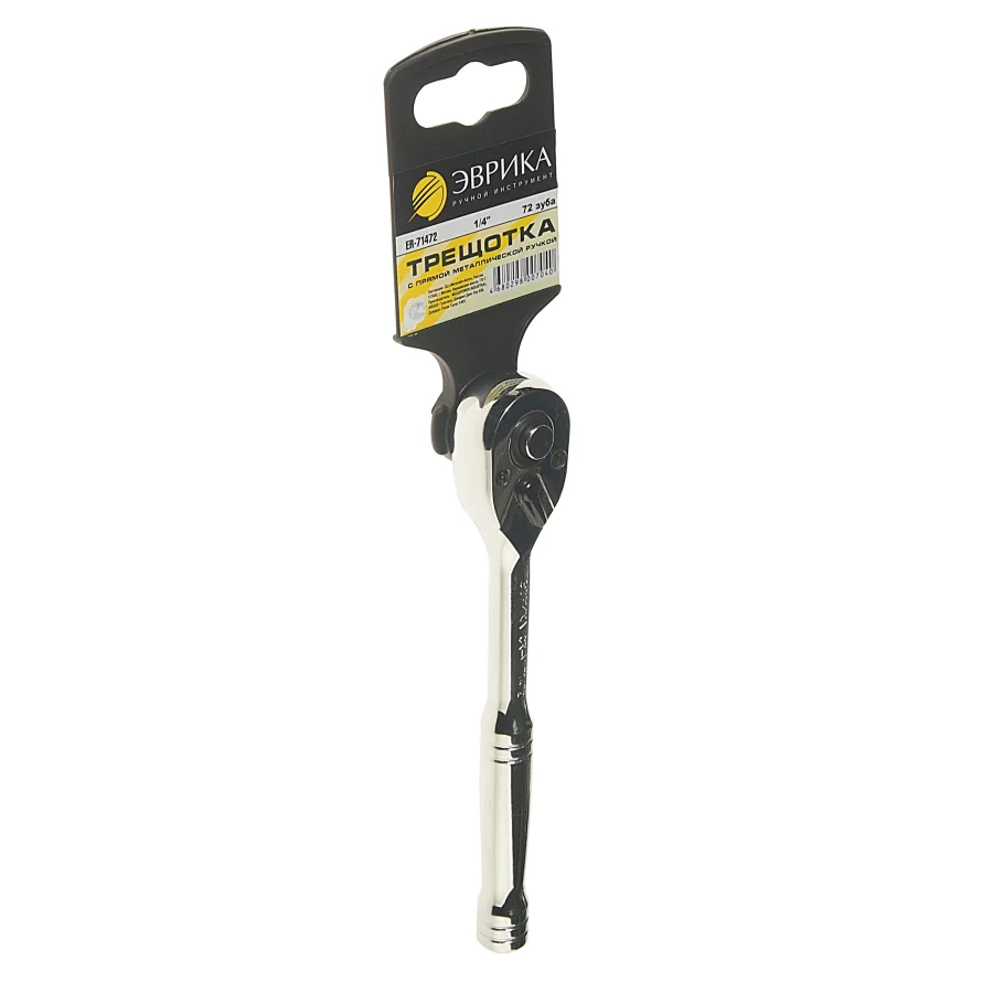 Трещотка с прямой металлической ручкой ЭВРИКА 1/4 72-зубцовая ER-71472 представляет собой удобный инструмент для монтажа и демонтажа крепежных элементов различного вида. Благодаря флажковому переключателю и кнопке быстрого сброса можно быстро сменить направление вращения или оснастку. Технические характеристики: Трещотка: есть Диэлектрическое покрытие: нет Количество зубьев: 72 шт Шарнирный механизм: нет Посадочный квадрат: 1/4 дюйма Удлинитель: нет
