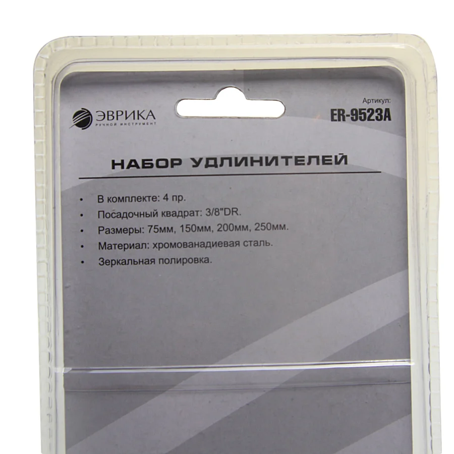 Набор удлинителей 4 предмета 3/8 DR; 75-250 мм ЭВРИКА ER-9523A Весь инструмент, который представлен в наборе, изготавливается из качественного материала и соответствует международным стандартом качества. Технические характеристики: Материал: Хром-ванадиевая сталь(CrV) Посадочный квадрат 3/8 дюйм Размер посадки под оснастку: 3/8 дюйма Male DR Размер посадки на инструмент: 3/8 дюйма Female DR Ударная: нет Размеры: 75, 150, 200, 250 мм