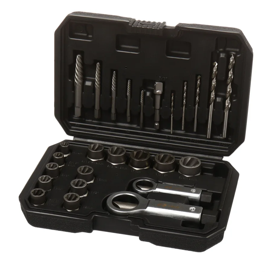 Головки: 1/4“, 5/16”(8 мм), 3/8“, 10 мм, 7/16”-11 мм, 1/2“, 12 мм, 13 мм, 9/16-14 мм, 5/8”-16 мм, 17 мм, 11/16“, 3/4”-19 мм (длина 28 мм) Экстрактор: 1#(2,5-4 мм Длина: 52 мм), 2#(3-5 мм Длина: 59 мм), 3#(3-6 мм Длина: 67 мм), 4#(4-9 мм Длина: 76 мм), 5#(6-11 мм Длина: 83 мм) Сверла: 3/32“(длина: 57 мм), 1/8”(длина: 66 мм), 5/32(длина: 76 мм), 1/4" (длина: 102 мм), 9/32" (длина: 108 мм) Гайкоруб: 12-16 мм, 16-22 мм Адаптер AD; 1/4" х 3/8" (длина 66 мм)