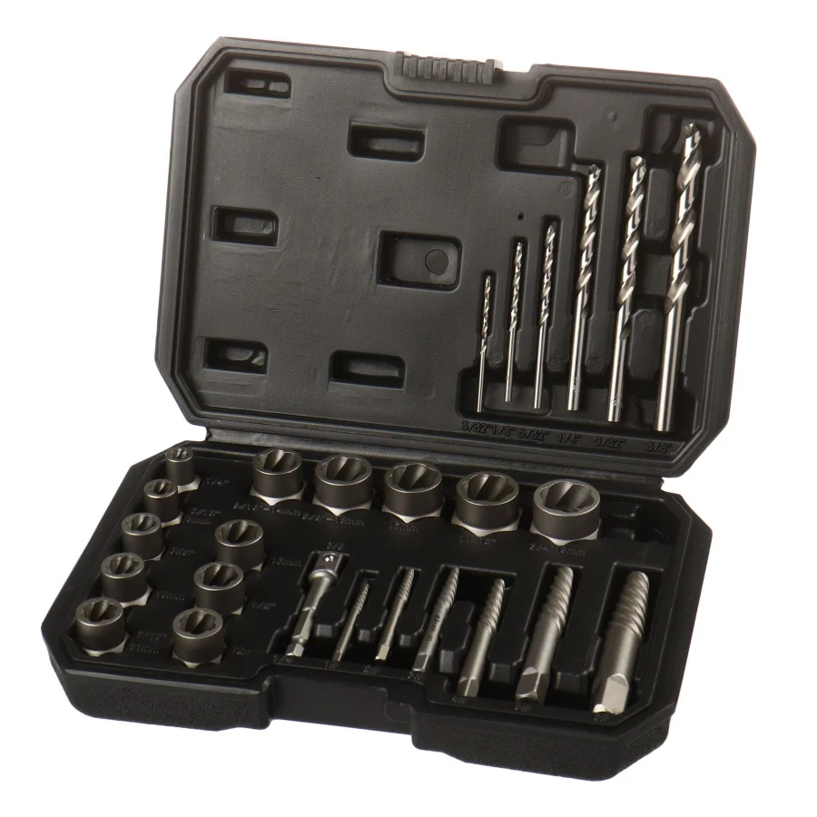 Головки: 1/4", 5/16"(8 мм), 3/8", 10 мм, 7/16"-11 мм, 1/2", 12 мм, 13 мм, 9/16-14 мм, 5/8"-16 мм, 17 мм, 11/16", 3/4"-19 мм (длина 28 мм) Адаптер; AD 1/4" на 3/8"(длина 66 мм) Экстрактор; 1#(длина 2,5-4 мм: 52 мм), 2#(длина 3-5 мм: 59 мм), 3#(длина 3-6 мм: 67 мм), 4#(длина 4-9 мм: 76 мм), 5#(6-11 мм длина: 83 мм), 6#(8-15 мм длина: 92 мм) Сверла: 3/32“ (длина: 57 мм), 1/8” (длина: 66 мм), 5/32 (длина: 76 мм), 1/4“ (длина: 102 мм), 9/32” (длина: 108 мм), 3/8 (длина: 124 мм)