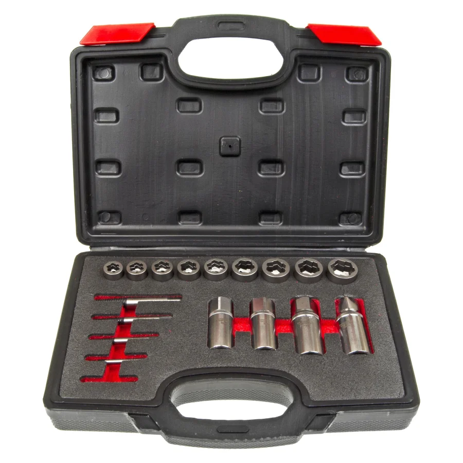 Набор для откручивания заломанных болтов, гаек и шпилек 18 предметов в кейсе ЭВРИКА. Инструменты для выкручивания сломанных болтов и гаек: экстракторы, головки и специальные наборы В процессе работы с резьбовыми соединениями часто возникают ситуации, когда необходимо выкрутить поврежденные или сломанные болты и гайки. Для этого существуют специальные наборы, включающие экстракторы, головки и другие инструменты, которые позволяют легко справляться даже с наружными повреждениями резьбы. Набор экстракторов для выкручивания сломанных болтов и гаек — идеальный инструмент, позволяющий извлекать детали без повреждения резьбы и окружающих поверхностей. Специальные головки и экстракторы помогают избежать сложного высверливания, сохраняя целостность резьбы и других деталей, что обеспечивает быстрое и безопасное извлечение поврежденных элементов. Экстракторы оснащены острыми головками, что облегчает процесс удаления поврежденных крепежей. С нашими инструментами вы сможете легко извлечь обломанные болты и гайки, сохраняя целостность головок и креплений. Набор экстракторов резьбы, упакованный в прочный чемодан-кейс, включает 18 предметов. Подходит для работы с резьбовыми соединениями на колесах, а также для откручивания секретных болтов и гаек, кроме того, этот набор станет отличным подарком, радуя как дедушку, так и сына, мужа, дядю и брата. Набор инструментов можно использовать для ремонта большинства автомобилей. Модель проходит контроль качества на заводе изготовителя, и повторный контроль перед поступлением в продажу.