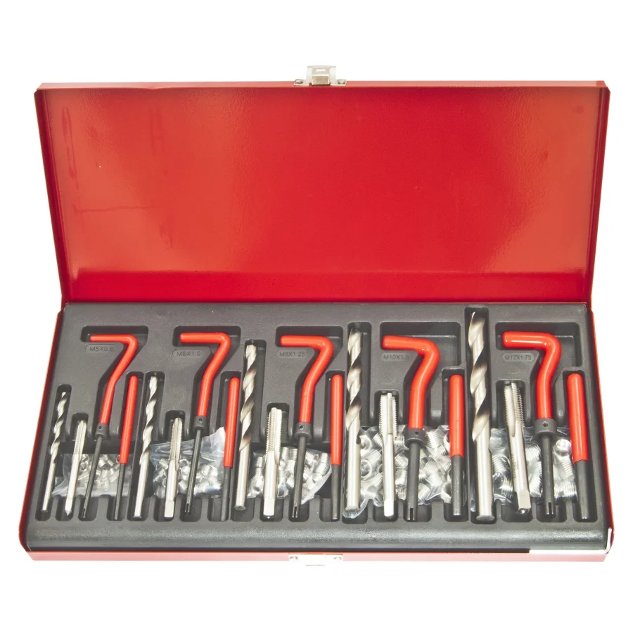 - Применение данного набора обеспечивает быстрое восстановление поврежденной резьбы при помощи специальных приспособлений.