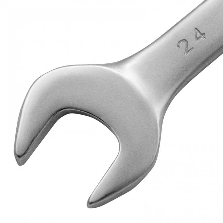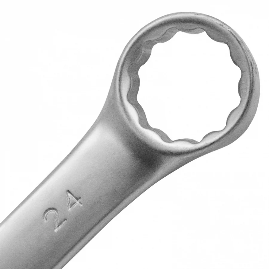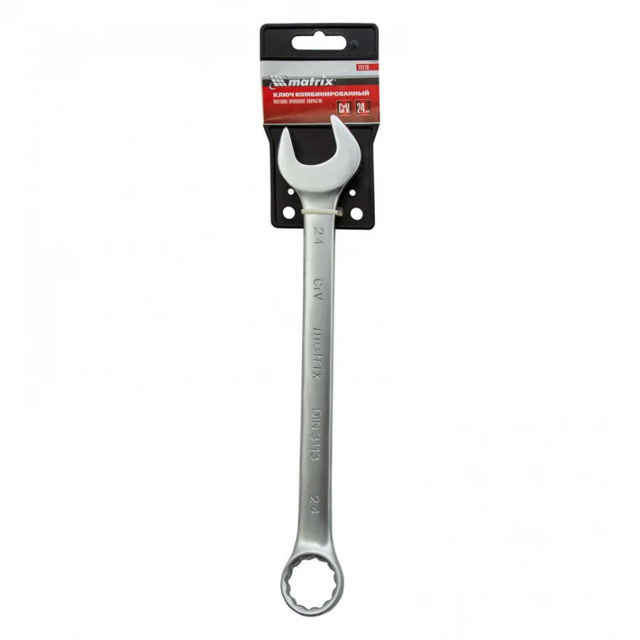 Комбинированный ключ Matrix 15119 размером 24 мм, из стали CrV, с покрытием «матовый хром», пригодится во время ремонтных работ дома или в гараже. С его помощью можно быстро монтировать и демонтировать крепежные элементы. Угол наклона кольцевого зева относительно плоскости инструмента составляет 15°, поэтому ключом удобно работать в труднодоступных местах.