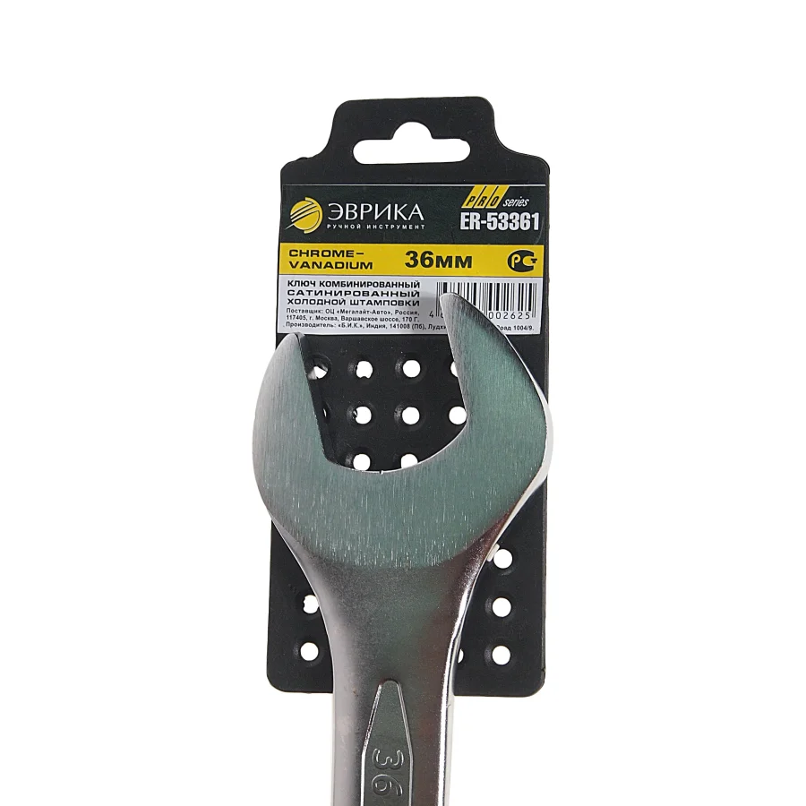 Комбинированный ключ 36мм Chrome vanadium на держателе ЭВРИКА ER-53361 позволяет работать с крепежом с торца или сбоку. Инструмент выполнен из прочной стали, легированной хромом и ванадием. Это обеспечивает защиту от коррозии. Технические характеристики: Покрытие: хромирование Трещотка: нет Длина: 385 мм Размер min: 36 мм Размер min(дюйм): нет Размер max: 36 мм Размер max(дюйм): нет Материал: CrV Шарнирный механизм: нет Диэлектрическое покрытие: нет Количество граней кольцевой головки: 12 Вес: 0.928 кг Вид: миллиметровый
