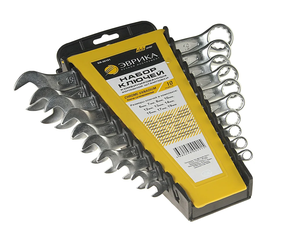 Набор комбинированных ключей 6-19мм холдер 10 предметов Chrome vanadium ЭВРИКА ER-50101 позволяет монтировать и демонтировать шестигранный крепеж различной сложности. Ключи изготавливаются из хром-ванадиевой стали, выпускаются всех размеров, в наборах используются наиболее востребованные позиции. Прочная сталь и защитное покрытие продлевают срок службы каждого инструмента. Технические характеристики: Тип: рожковые/накидные Размер min: 6 мм Размер max: 19 мм Размер min (дюйм): нет Размер max (дюйм): нет Трещотка: нет Покрытие: хромоникелевое Материал: CrV Количество в наборе: 10 шт Диэлектрическое покрытие: нет Вид: миллиметровый Размер min (Т/E): нет Размер max (T/E): нет Форма: прямой Вид упаковки: пластиковый держатель С шаровым окончанием: нет Шарнирный механизм: нет