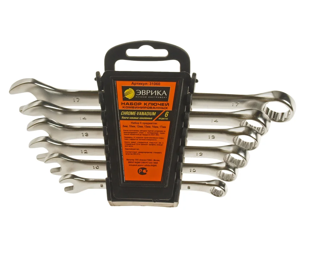 Набор ключей комбинированных 8-17мм сатинированных холдер 6 предметов ЭВРИКА ER-31060 позволяет монтировать и демонтировать шестигранный крепеж различной сложности. Прочная сталь и защитное покрытие продлевают срок службы каждого инструмента. Технические характеристики: Количество предметов: 6 Размеры ключей в наборе, мм: 8-17 Вес: 0,47 кг