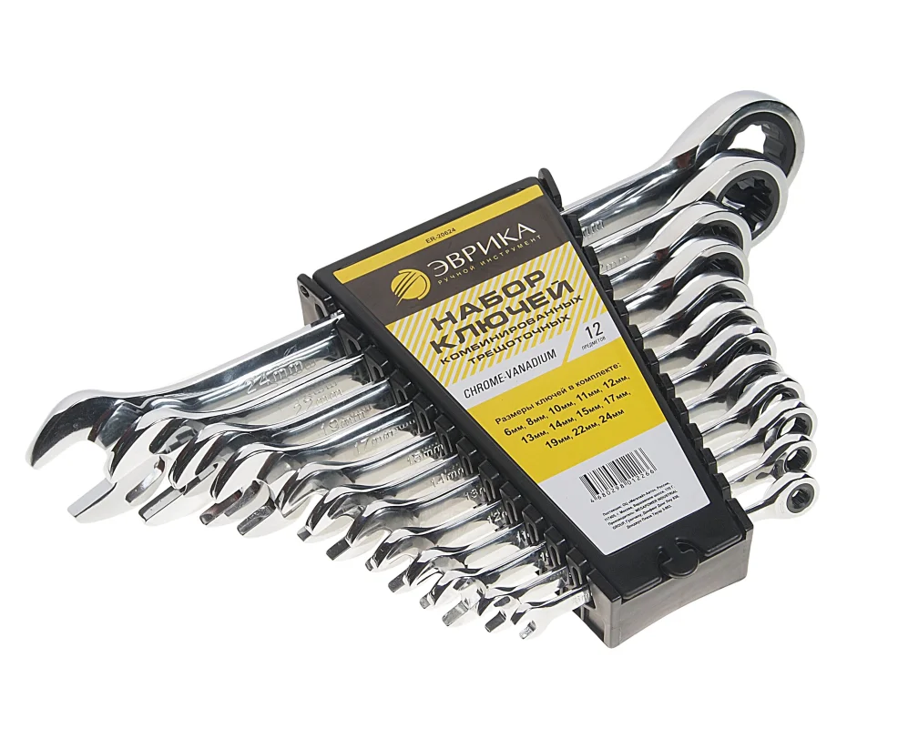 Набор комбинированных трещоточных ключей 12 предметов ЭВРИКА ER-20624 позволяет монтировать и демонтировать шестигранный крепеж различной сложности. Ключи изготавливаются из хром-ванадиевой стали, выпускаются всех размеров, в наборах используются наиболее востребованные позиции. Прочная сталь и защитное покрытие продлевают срок службы каждого инструмента. Технические характеристики: Тип: рожковые/накидные Размер min: 6 мм Размер max: 24 мм Размер min (дюйм): нет Размер max (дюйм): нет Трещотка: есть Покрытие: хромоникелевое Материал: CrV Количество в наборе: 12 шт Диэлектрическое покрытие: нет Вид: миллиметровый Размер min (Т/E): нет Размер max (T/E): нет Форма: прямой Вид упаковки: пластиковый держатель С шаровым окончанием: нет Шарнирный механизм: нет
