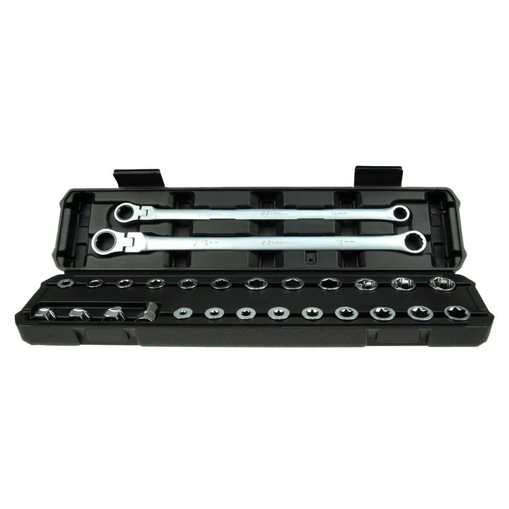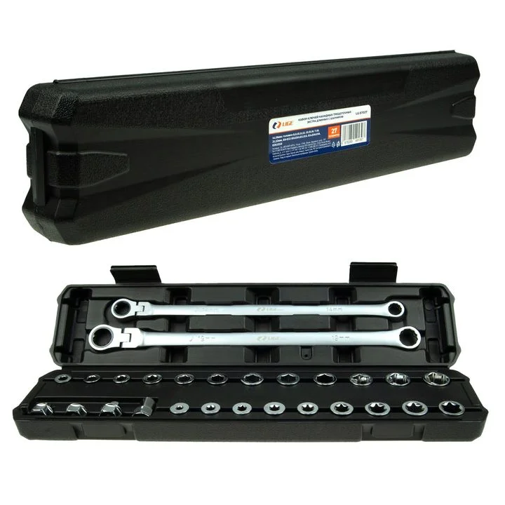 "НАБОР КЛЮЧЕЙ НАКИДНЫХ ТРЕЩОТОЧНЫХ ЭКСТРА ДЛИННЫХ С ШАРНИРОМ 27ПР ключи 2шт: 14,19мм; головки 8,9,10,11,12,13,15,16,17,18,21,22мм, E8,E10,E11,E12,E14,E16,E18,E20,E22 адаптеры 4шт: 10х19мм (магнитный) 1/4""х19мм 3/8""х19мм 1/2""х19мм Материал CR-V, Размер 485 × 105 × 60мм, Вес 1.61кг"