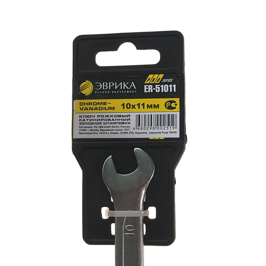 Рожковый ключ 10x11мм Chrome vanadium на держателе ЭВРИКА ER-51011. Ключ рожковый 10x11мм на держателе — это незаменимый инструмент для каждого автомобилиста и специалиста в области ремонта. Если вы ищете надежное и качественное решение для работы с крепежами вашего автомобиля, этот ключ станет отличным выбором. Он обеспечивает удобство и эффективность в процессе выполнения различных задач. Данный инструмент изготовлен из прочной стали, что гарантирует его долговечность и устойчивость к износу. Ключи, подобные этому, идеально подходят для работы в ограниченных пространствах, где требуется высокая точность и аккуратность. Благодаря оптимальным размерам, вы сможете легко справляться с крепежами, которые сложно достать другими инструментами. Ключ рожковый на держателе не только удобен в использовании, но и компактен, что позволяет хранить его в любом ящике или сумке для инструментов. Рожковые ключи обеспечивают надежное сцепление с гайками и болтами, предотвращая их повреждение. Это особенно важно при выполнении сложных ремонтов, где требуется высокая степень аккуратности. Ключ рожковый 10x11мм на держателе станет вашим надежным помощником в любых ситуациях, связанных с ремонтом автомобиля. Обеспечьте себе комфорт и уверенность в выполнении работ, доверяя только качественным инструментам. Приобретая этот ключ, вы делаете шаг к повышению эффективности ваших ремонтных работ. Он станет отличным дополнением к вашему набору инструментов и поможет в решении множества задач. Не откладывайте на потом — обеспечьте себе надежность и качество, которые предлагает данный инструмент. Технические характеристики: Размер min: 10 мм Размер max: 11 мм Размер min(дюйм): нет Размер max(дюйм): нет Длина: 155 мм Материал: CrV Покрытие: сатинирование Диэлектрическое покрытие: нет Ударный: нет Двусторонний: да Односторонний: нет Коликовый: нет Шарнирный: нет Вид: миллиметровый Размер: 10х11 мм
