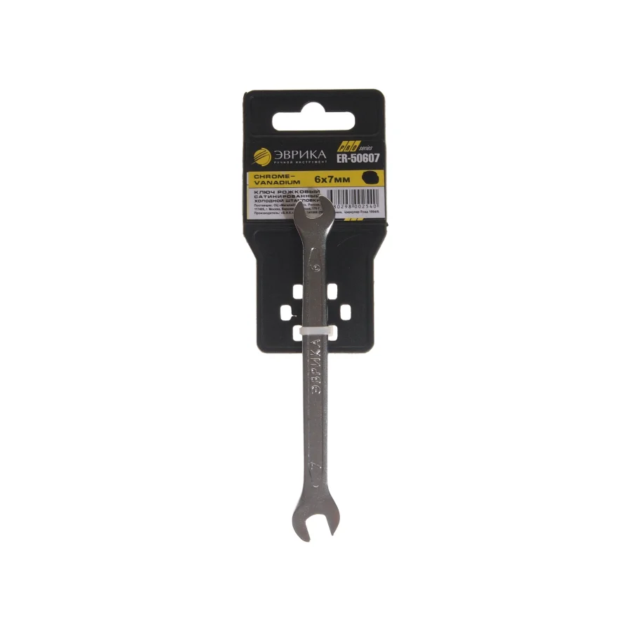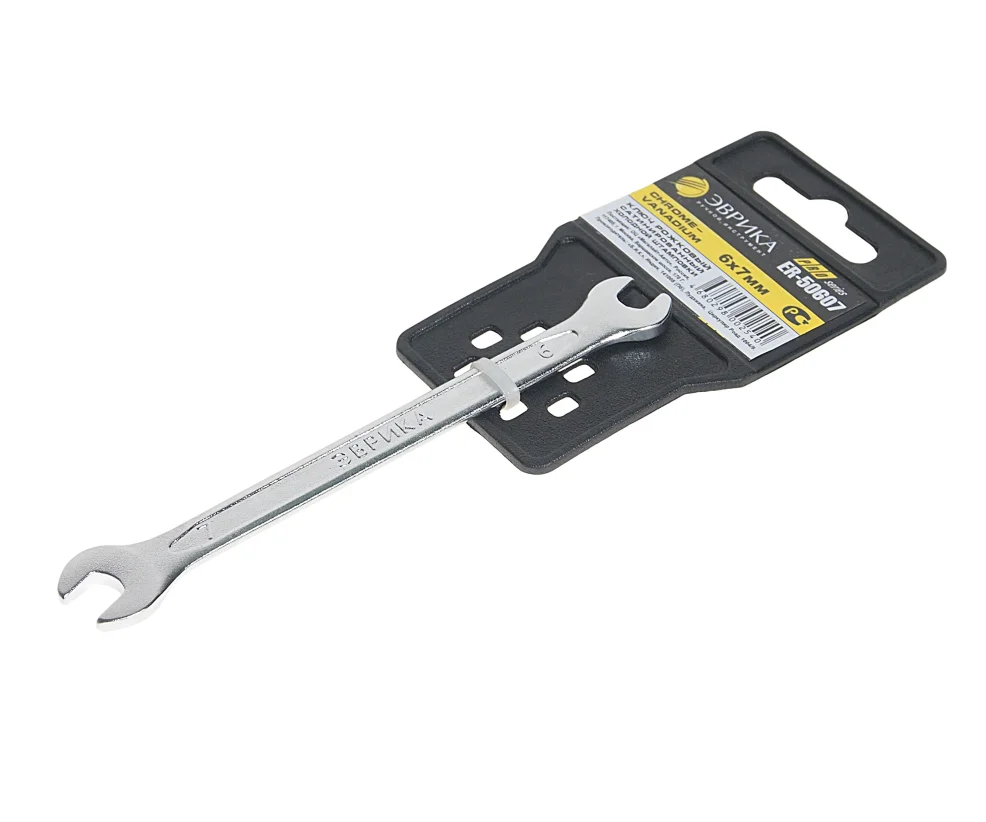 Рожковый ключ 6x7мм ЭВРИКА ER-50607. Ключ рожковый 6x7мм на держателе — это незаменимый инструмент для каждого автомобилиста и специалиста в области ремонта. Если вы ищете надежное и качественное решение для работы с крепежами вашего автомобиля, этот ключ станет отличным выбором. Он обеспечивает удобство и эффективность в процессе выполнения различных задач. Данный инструмент изготовлен из прочной стали, что гарантирует его долговечность и устойчивость к износу. Ключи, подобные этому, идеально подходят для работы в ограниченных пространствах, где требуется высокая точность и аккуратность. Благодаря оптимальным размерам, вы сможете легко справляться с крепежами, которые сложно достать другими инструментами. Ключ рожковый на держателе не только удобен в использовании, но и компактен, что позволяет хранить его в любом ящике или сумке для инструментов. Рожковые ключи обеспечивают надежное сцепление с гайками и болтами, предотвращая их повреждение. Это особенно важно при выполнении сложных ремонтов, где требуется высокая степень аккуратности. Ключ рожковый 6x7мм на держателе станет вашим надежным помощником в любых ситуациях, связанных с ремонтом автомобиля. Обеспечьте себе комфорт и уверенность в выполнении работ, доверяя только качественным инструментам. Приобретая этот ключ, вы делаете шаг к повышению эффективности ваших ремонтных работ. Он станет отличным дополнением к вашему набору инструментов и поможет в решении множества задач. Не откладывайте на потом — обеспечьте себе надежность и качество, которые предлагает данный инструмент. Технические характеристики: Размер min: 6 мм Размер max: 7 мм Размер min(дюйм): нет Размер max(дюйм): нет Длина: 120 мм Материал: CrV Покрытие: сатинирование Диэлектрическое покрытие: нет Ударный: нет Двусторонний: да Односторонний: нет Коликовый: нет Шарнирный: нет Вид: миллиметровый Размер: 6х7 мм