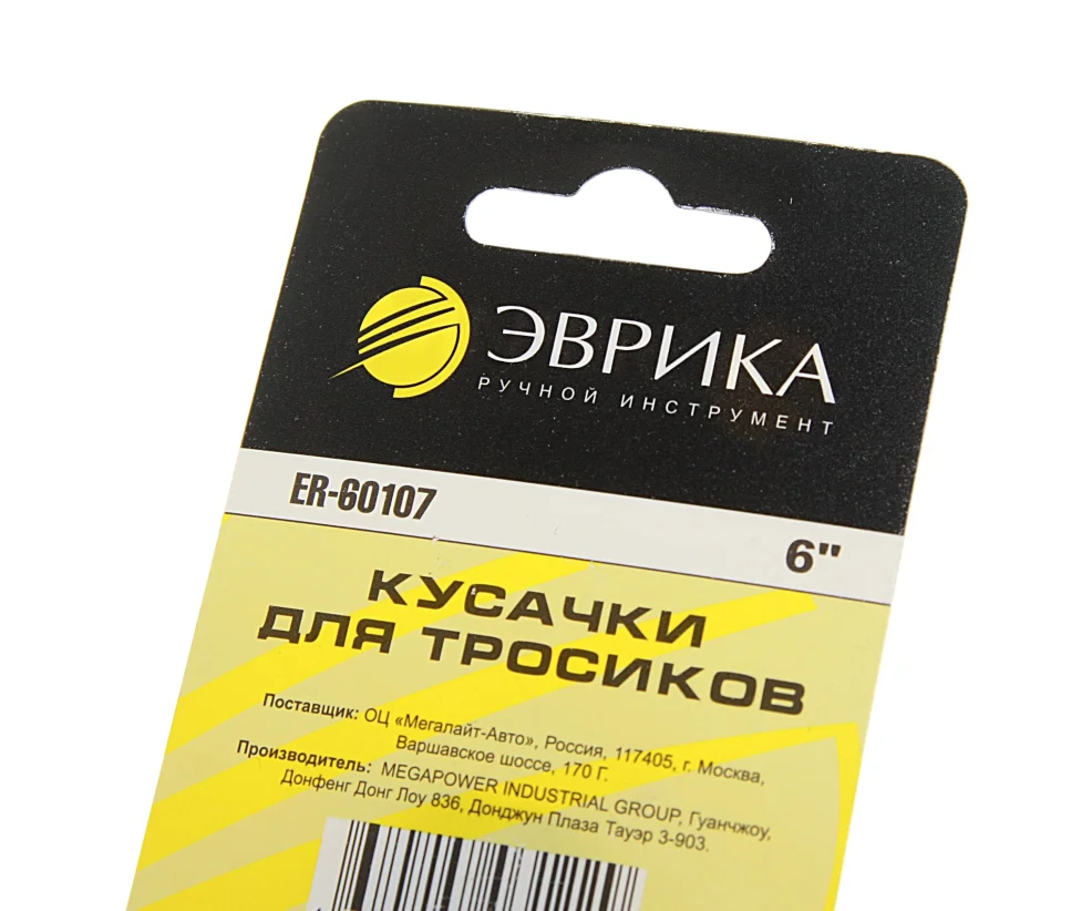 Кусачки для тросиков 6 ЭВРИКА ER-60107 способны резать листовой металл и проволоку. Это требует от работника приложения небольших усилий. Рукоятки не скользят даже в мокрых ладонях, что исключает образование мозолей. Технические характеристики: Вид: кусачки Тип: торцевые Тип заточки лезвия: обычная Длина: 155 мм Диэлектрическое покрытие: нет Функция "антистатик": нет Цвет рукояток: черный/желтый Материал губок: CrV Рукоятки-чехлы: двухкомпонентные Усиленные: нет Вес: 0.249 кг