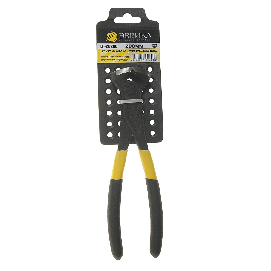 Торцевые кусачки 200мм ЭВРИКА ER-26200 способны резать листовой металл и проволоку. Это требует от работника приложения небольших усилий. Рукоятки не скользят даже в мокрых ладонях, что исключает образование мозолей. Технические характеристики: Вид: кусачки Тип: торцевые Тип заточки лезвия: обычная Длина: 200 мм Диэлектрическое покрытие: нет Функция "антистатик": нет Цвет рукояток: черный/желтый Материал губок: CrV Рукоятки-чехлы: противоскользящее покрытие Усиленные: нет Вес: 0.372 кг