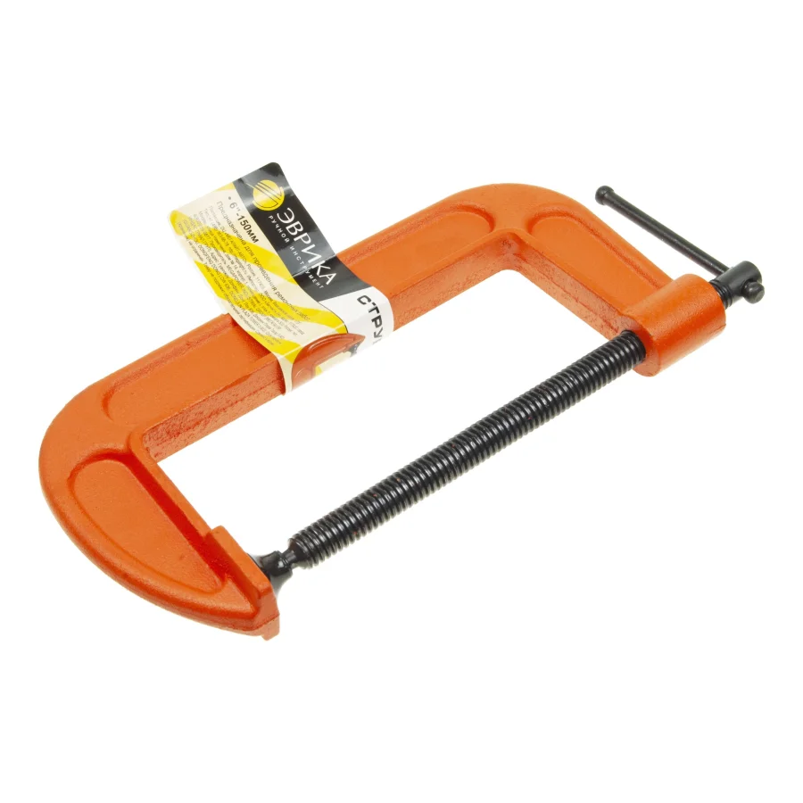 Струбцина ER-16150 Г-образная 6"-150мм ЭВРИКА. Струбцина G-образная, представляет собой эффективный зажимной инструмент, который применяется при работе с деталями из различных материалов. Предназначена для фиксации предметов и прижимания их друг к другу. Применяется для кузовных работ, является профессиональным инструментом и предназначена для надежной фиксации заготовок в нужном положении. Струбцина состоит из двух элементов: подвижного элемента, регулирующего силу зажима и расстояние между губками, а так же рамы. Подвижная часть имеет специальный рычаг для удобной работы и надежной фиксации заготовки. Максимальный диапазон зажима ''6''-150мм. Для защиты поверхности деревянных деталей от повреждения рекомендуется использовать накладки или подкладывать под губки мягкие бруски.