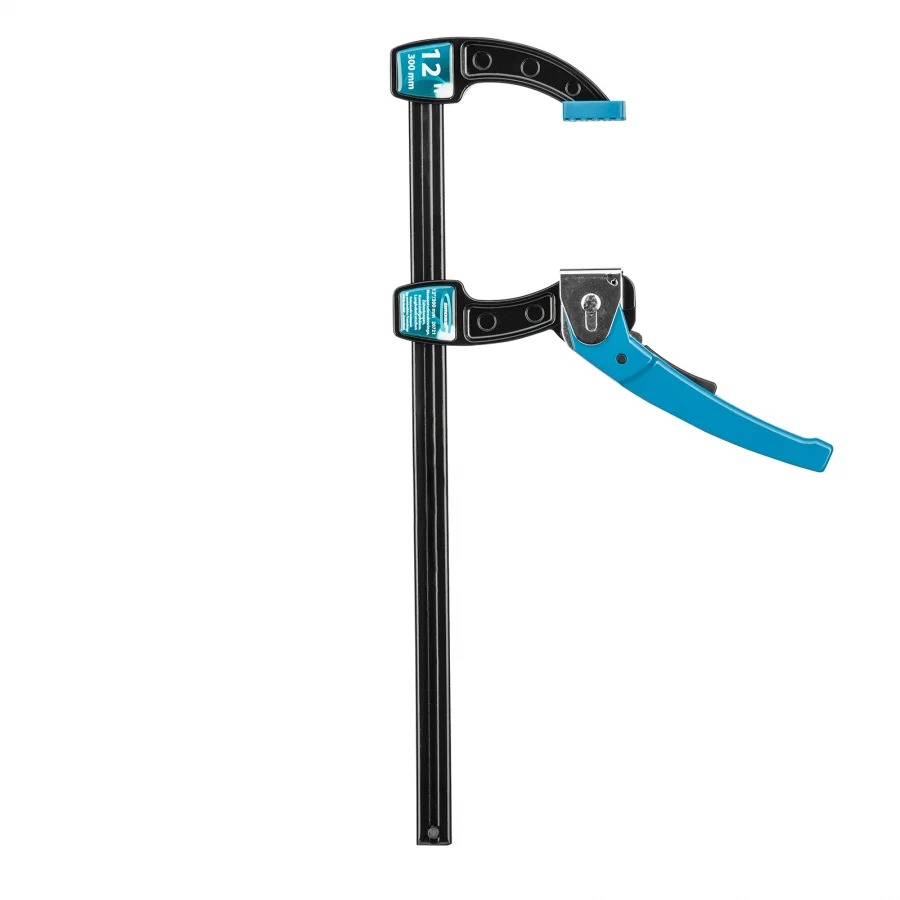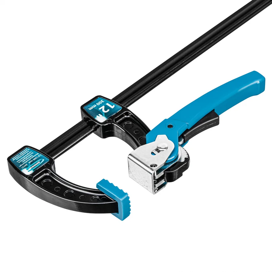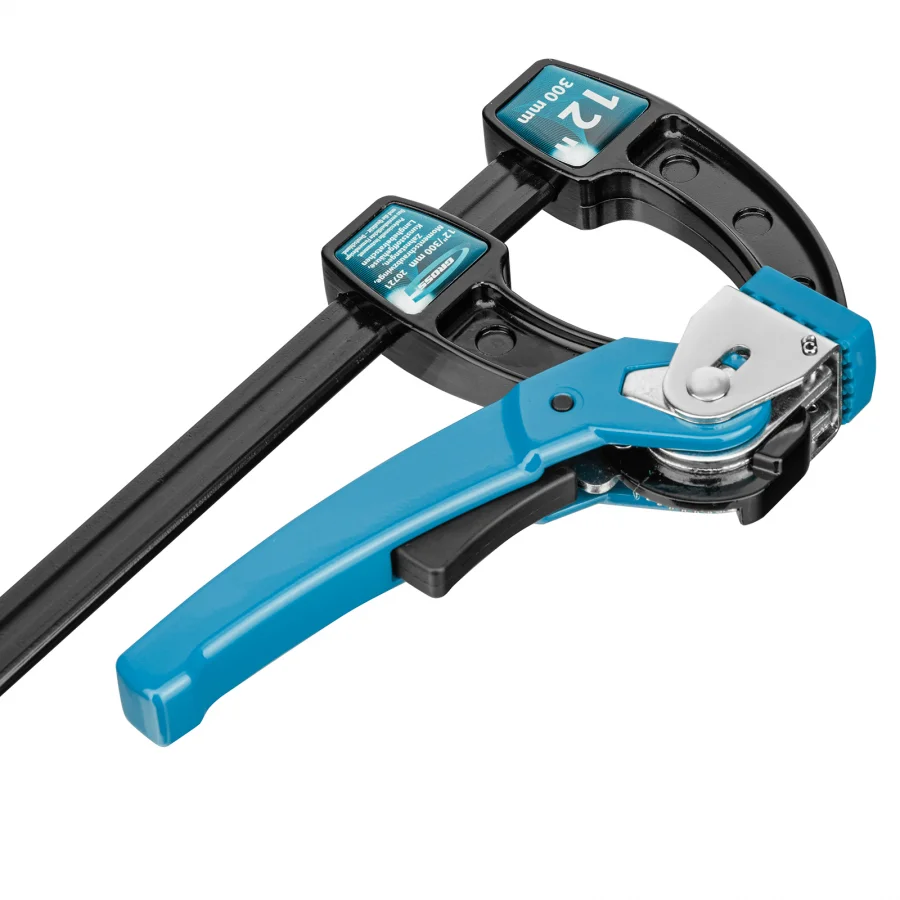 Реечная быстрозажимная струбцина Gross 20721, в металлическом корпусе, с рычажным храповым механизмом, служит для фиксации деталей и конструкций толщиной до 12 дюймов / 300 мм. Губки подводят вплотную к детали, а храповый механизм с рычагом позволяет окончательно зафиксировать ее, максимально используя мускульную силу. Стопорный механизм VIBRAFIX способен удерживать предметы с усилием 1200 Н. Струбцина используется для выполнения профессиональных столярных и слесарных работ.
