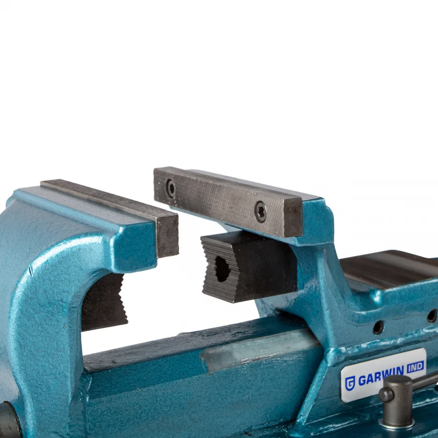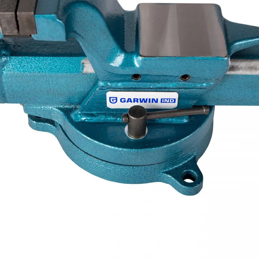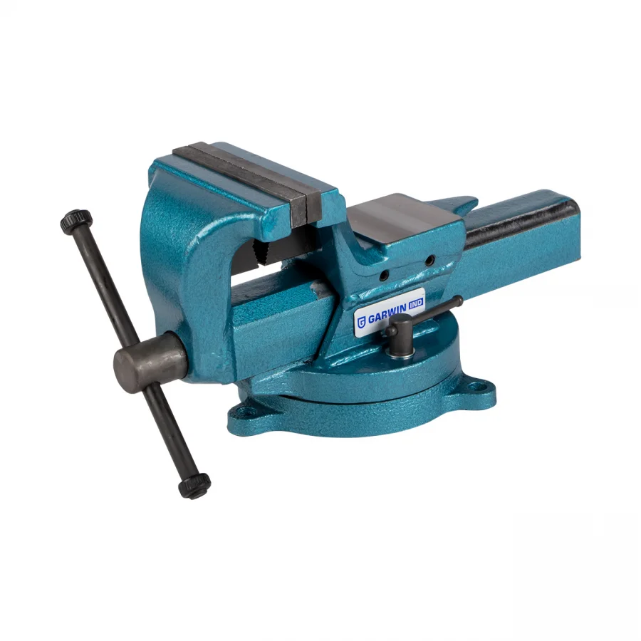 Тиски слесарные GARWIN INDUSTRIAL GV-KT5 из углеродистой стали, кованые, с поворотным механизмом, съёмными губками и наковальней. Используются для четкой фиксации деталей во время резки, строгания, сверления, шлифования, сборки-разборки механизмов и узлов.