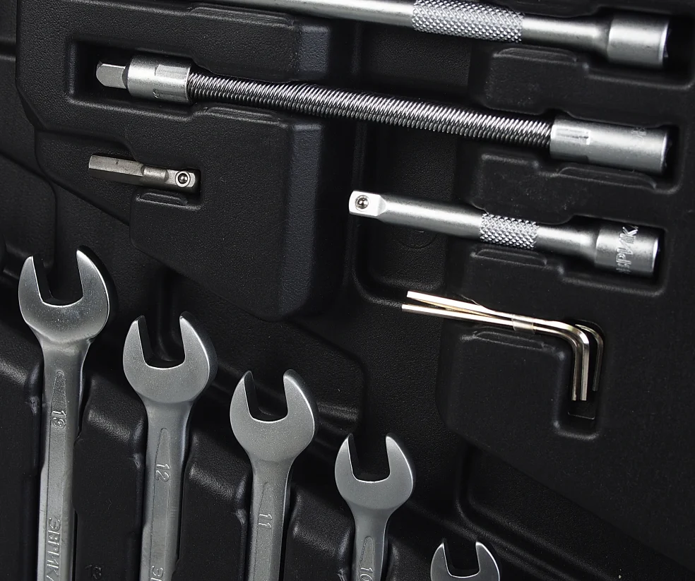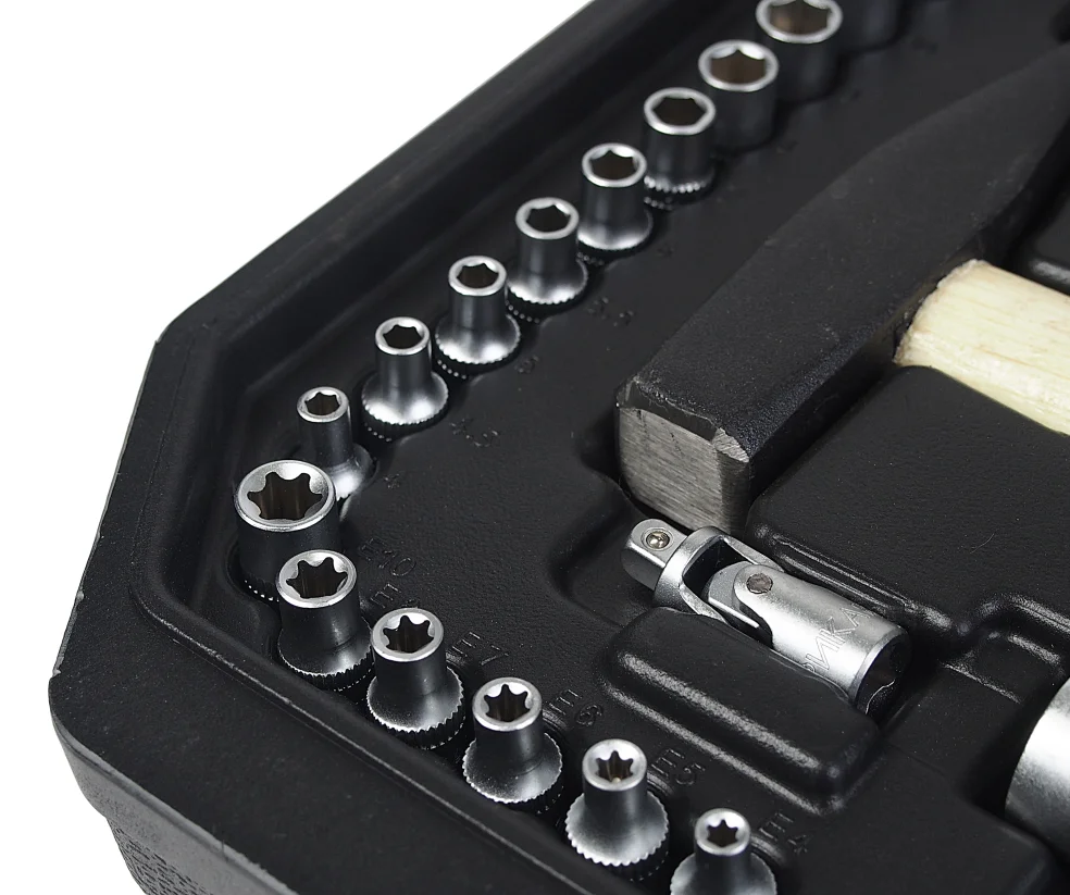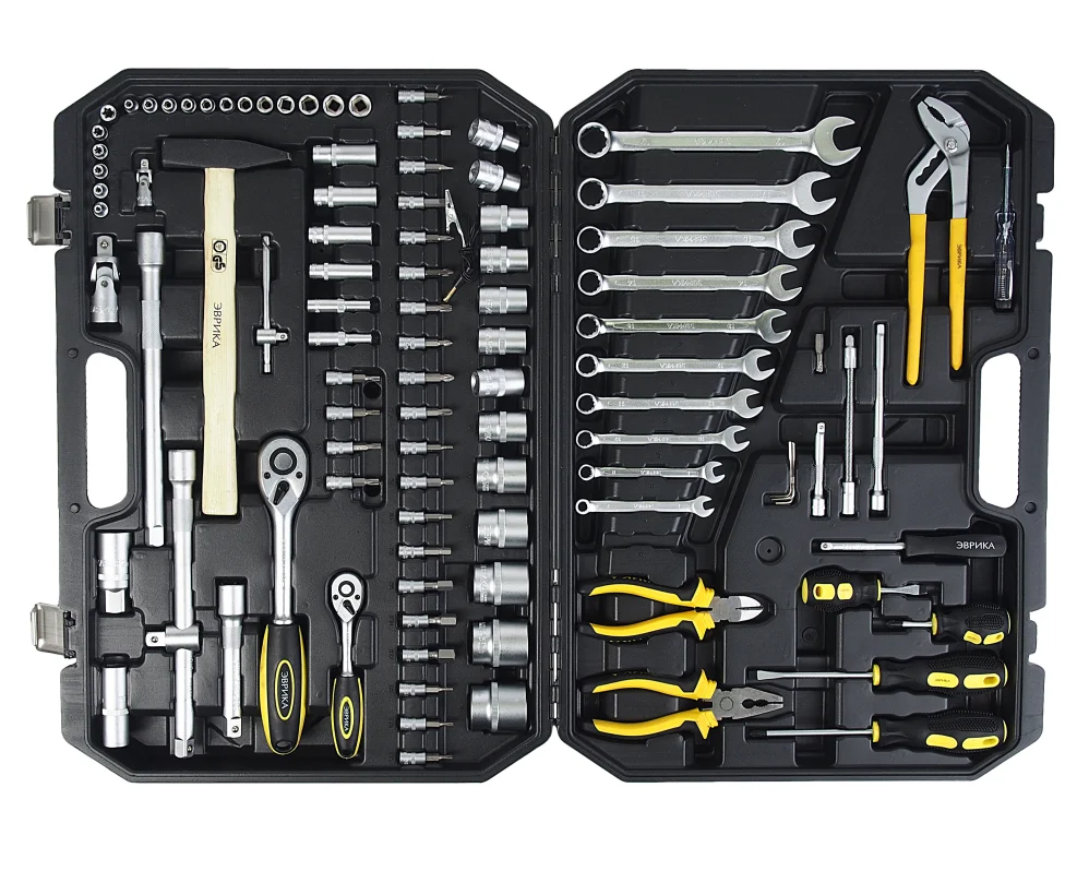 Набор инструмента ER-80001 1/4" 1/2" DR 6-гранный 101 предмет ЭВРИКА. Комплектация: 1/4: головка(6граней): 4, 4.55, 5.5, 6-13мм; головка(6граней) глубокая: 6, 7, 10- 13мм; Головка Епрофиль: E4, E5, E6, E7, E8, E10; удлинитель: 75, 150мм; кардан шарнирный; трещотка; отвертка-вороток: 150мм; гибкийудлинитель: 150мм; адаптер для бит 1/4х1/4; вороток Т-образный спередвижной головкой; Насадка: Hex: 3, 4, 5, 6, 8, 10, 12мм; Torx: T8, Т10, Т15, Т20, Т25, Т27, Т30; Slotted: SL3, SL4, SL5.5, SL7мм; Phillips: PH1, PH2, PH3; Pozidrive: PZ1, PZ2, PZ3. 1/2: головка(6граней): 10-15,17,19,22,24,27,30,32мм; Головка свечная(6граней): 16,21мм; удлинитель: 125,250ммх2; адаптер 3/8"(F)х1/2"(M); трещотка; кардан шарн. Ключ шестигранный Г-образный: 1.5, 2, 2.5мм; Ключ комбинированный: 6, 7, 8, 10-15, 17, 19мм; Пассатижи комб.: 160мм; Пассатижи переставные: 225мм; бокорезы: 160мм; молоток слесарный: 300гр; отвертки: Slotted: SL6x40мм; SL6x100мм; Phillips: PH2x40мм; PH2x100мм; индикатор: 6-24В; Кейс. Отличный подарок папе, мужу, брату, дяде!