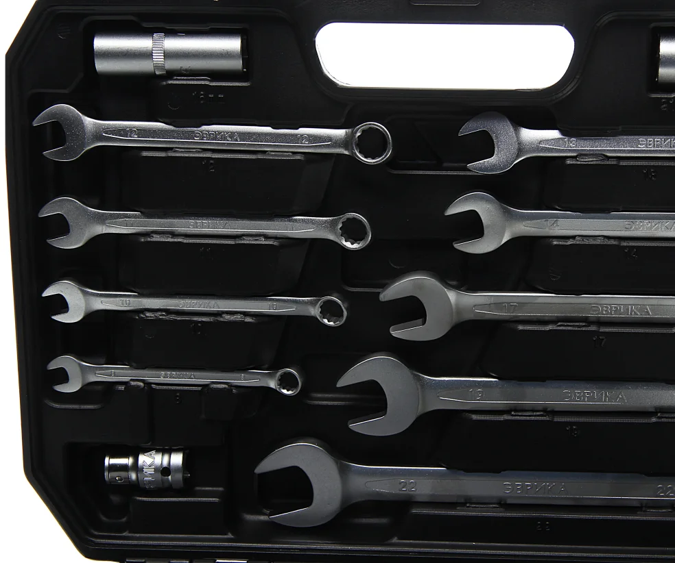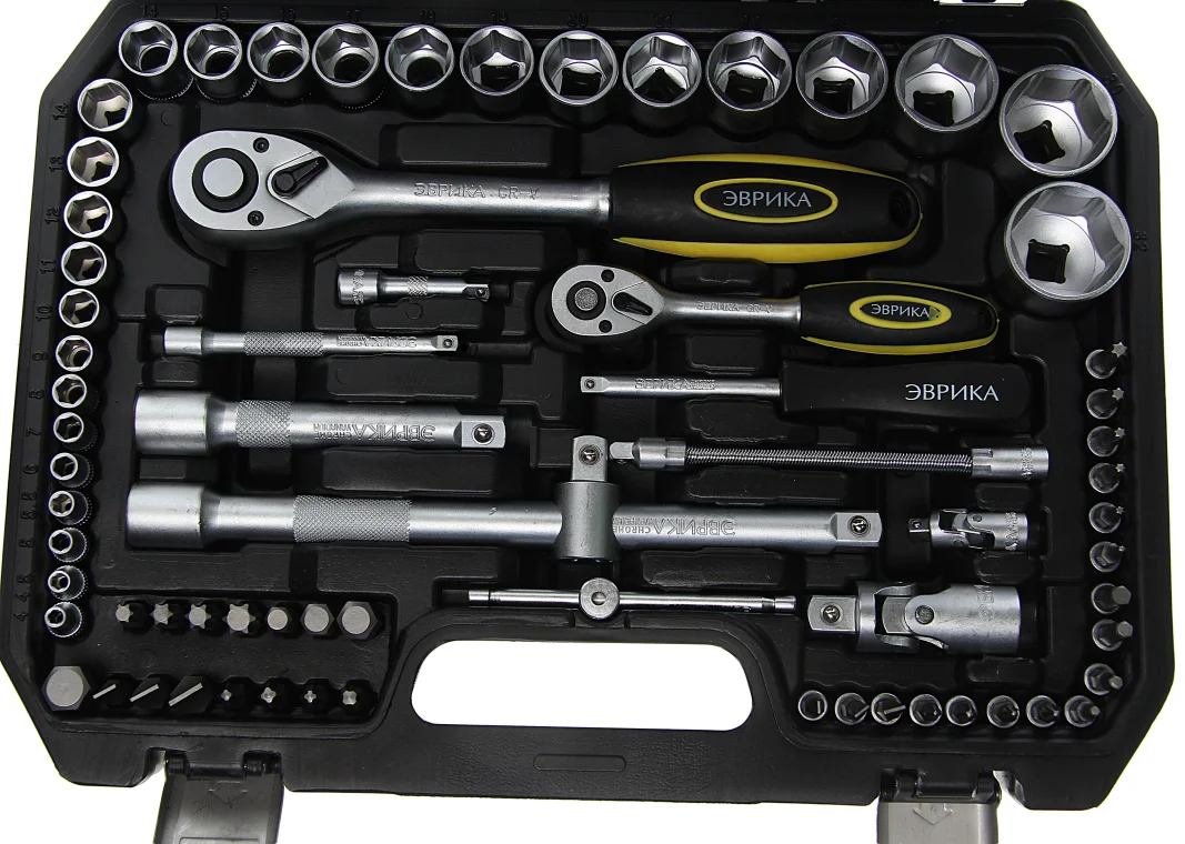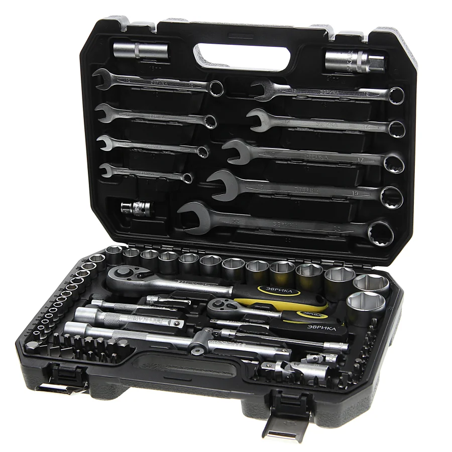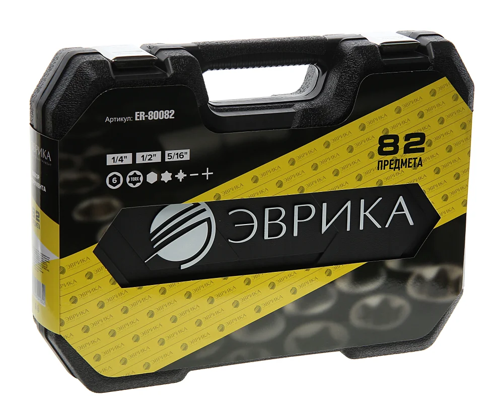 Набор инструментов 1/4" 1/2" 5/16" 82 предмета ER-80082. Универсальный набор инструментов 82 предмета, которые помогут вам справиться с любыми задачами, будь то ремонт машины или мелкие работы по дому. Набор включает в себя инструменты с различными посадками: 1/2, 1/4 и 5/16. Идеальным выбором как для профессионалов, так и для любителей. Инструменты аккуратно упакованы в прочный кейс, что обеспечивает удобство хранения и транспортировки. Набор ключей для автомобиля будет полезен как для выполнения регулярного обслуживания вашего транспортного средства, так и для экстренных ситуаций на дороге. Набор инструментов 82 предмета Эврика — отличный вариант для подарка на день рождения, 23 февраля или любой другой праздник деду, сыну, дяде, и мужу, ведь каждый мужчина оценит возможность иметь под рукой надежные инструменты для решения повседневных задач. Набор ключей с трещоткой, ударные головки и комбинированные ключи — все это сделает вашу работу более эффективной и быстрой. Инструменты для авто и дома, которые входят в этот комплект, помогут вам сэкономить время и силы при ремонте и обслуживании. Выбирайте надежность и качество! Комплектация: 1/4": Головка (6 граней): 4, 4.5, 5, 5.5, 6, 7, 8, 9, 10, 11, 12, 13, 14 мм; Удлинитель: 50 мм, 100 мм; Кардан шарнирный; Трещотка; Отвертка-вороток; Гибкий удлинитель; Вороток Т-образный с передвижной головкой; Биты: Hex: 3, 4, 5, 6 мм; Torx: T8, Т10, Т15, Т20, Т25, Т30 мм; Slotted: SL4, SL5.5, SL7 мм; Phillips: PH1, PH2; Pozidrive: PZ1, PZ2; 1/2": Головка (6 граней): 14, 15, 16, 17, 18, 19, 20, 21, 22, 24, 27, 30, 32 мм; Головка свечная (6 граней): 16 мм, 21 мм; Адаптер 3/8""(F)х1/2""(M); Держатель бит: 1/2""х5/16""; Удлинитель: 125 мм, 250 мм; Трещотка; Кардан шарнирный; 5/16": Бита 6-гранная: Hex: 8, 10, 12, 14 мм; Torx: T40, Т45, Т50, Т55 мм; Slotted: SL8, SL10, SL12 мм; Phillips: PH3, PH4; Pozidrive: PZ3, PZ4; Ключ комбинированный: 8, 10, 11, 12, 13, 14, 17, 19, 22 мм";