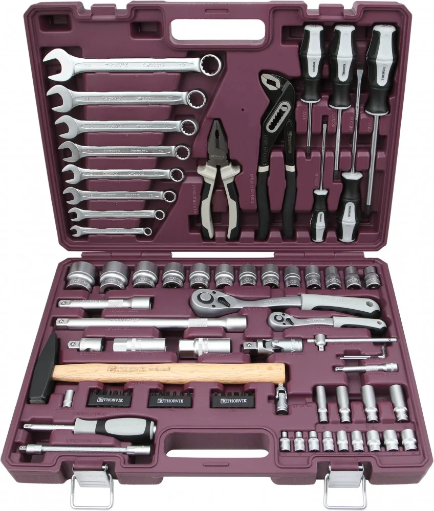Описание Инструментальные наборы Thorvik - это высокое качество изделий, входящих в состав наборов, удобные прочные кейсы для хранения, оптимальная комплектация позволяющая удовлетворить потребность мастера при обслуживании техники и обеспечить всем необходимым рабочее место при производстве комплексных слесарно-монтажных или механосборочных работ. Наборы Thorvik имеют ударопрочный морозоустойчивый кейс с надеждными защелками. Самые полные и удобные по наполнению комплектации для всех типов задач. Область применения Универсальный набор инструмента с адаптированным ассортиментом изделий, позволяющих производить определенный спектр операций по обслуживанию различных резьбовых соединений, включая обслуживание непрофилированных деталей и деталей с разнообразными внутренними рабочими профилями.