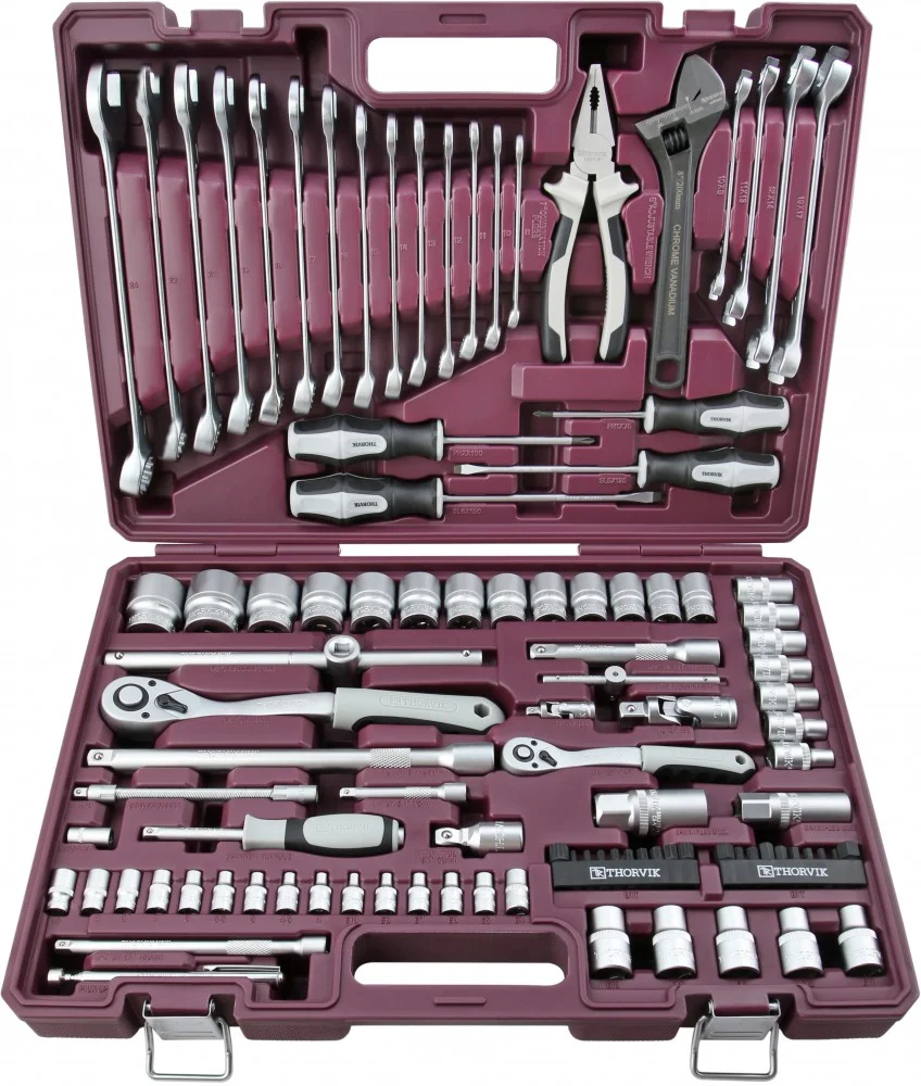 Описание Инструментальные наборы Thorvik - это высокое качество изделий, входящих в состав наборов, удобные прочные кейсы для хранения, оптимальная комплектация позволяющая удовлетворить потребность мастера при обслуживании техники и обеспечить всем необходимым рабочее место при производстве комплексных слесарно-монтажных или механосборочных работ. Наборы Thorvik имеют ударопрочный морозоустойчивый кейс с надежными металлическими замками, фосфатированное покрытие вставок бит обеспечит дополнительную стойкость к коррозии. Область применения Инструменты, представленные в наборе применяются при проведении работ связанных с обслуживанием изделий точной механики, электроники и бытовой техники, где рабочая зона ограничена и отсутствуют серьезные нагрузки. При производстве работ по обслуживанию автомобильной техники, благодаря небольшим размерам, набор незаменим для арматурных работ, ремонта и установки малых агрегатов и навесного оборудования двигателей.