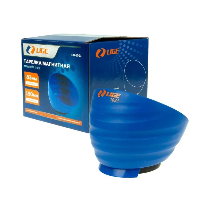 "Корпус чаши изготовлен из высокопрочного пластика, долговечен; широкий диапазон открывания и вместимость; подходит для хранения различных деталей; двухстороннее магнитное присосание, прочное магнитное основание; конструкция обеспечивает безопасность инструментов и деталей; магнитное основание снаружи обернуто; резиновый чехол препятствует скоплению железной стружки и не повреждает лакокрасочное покрытие автомобиля. Материал: пластик. Размер чаши: 150 × 122 мм (диаметр × высота). Диаметр магнита: 83 мм."