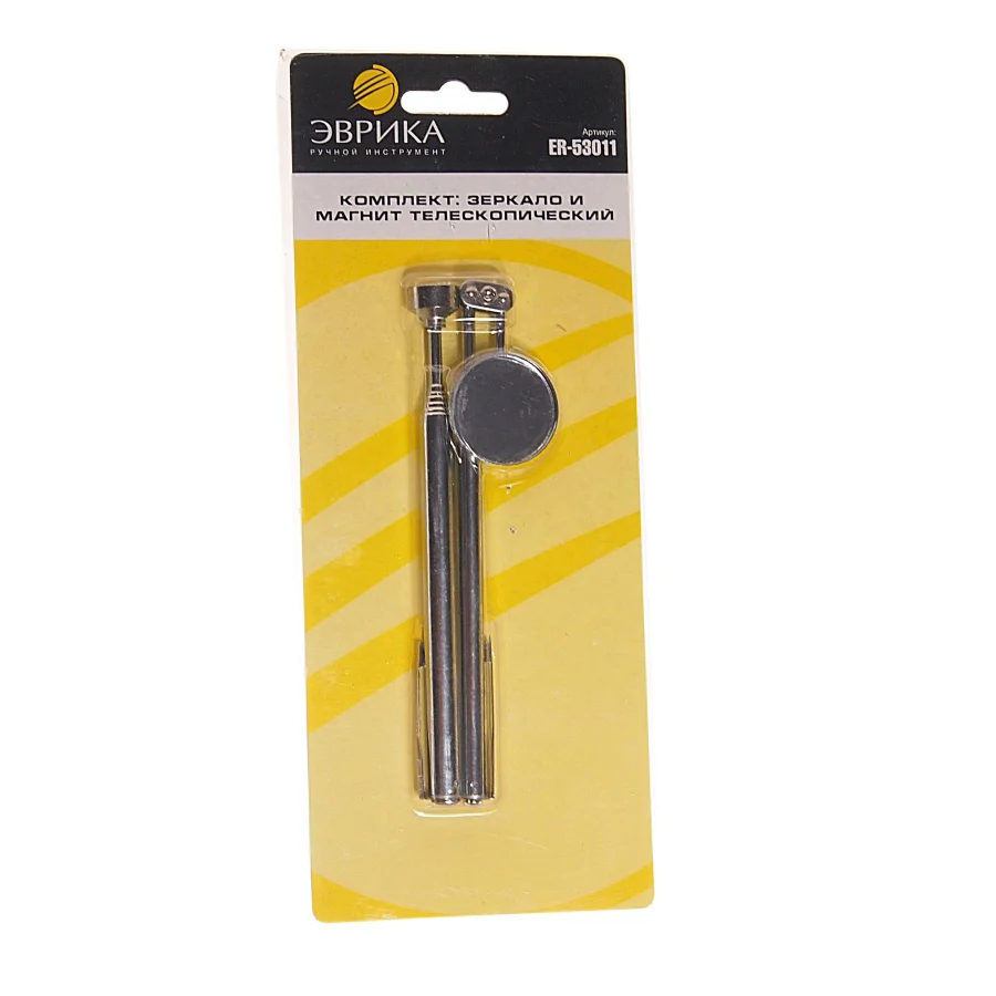 Набор ЭВРИКА ER-53011 включает в себя: Телескопическое круглое зеркало диаметром 30 мм — с его помощью вы сможете легко собрать сложные механизмы. Телескопический магнит, способный выдержать нагрузку до 1,3 кг — этот инструмент также станет вашим надежным помощником в работе. Оба инструмента имеют рельефные рукоятки, что обеспечивает удобство и комфорт в использовании. Технические характеристики: Длина: 650 мм Диаметр/диагональ зеркала: 30 мм Наличие подсветки: отсутствует Фонарик: не предусмотрен Диаметр магнита: 5 мм Элементы питания: не требуются Вес: 0,08 кг