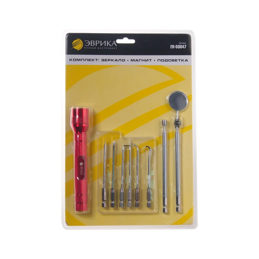 Набор фонарь 3LED, зеркало телескопическое 51см ЭВРИКА ER-53047 также включает в себя множество других вспомогательных инструментов, что значительно упрощает сборку сложных механизмов. Технические характеристики: Длина: 510 мм Диаметр/диагональ зеркала: 51 мм Зеркало с подсветкой: нет Фонарик: да Диаметр магнита: 5 мм Вес: 0,329 кг
