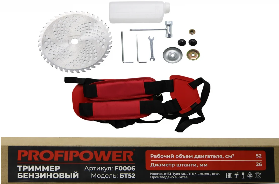 Триммер бензиновый PROFIPOWER БТ52 (52см³,1500Вт, 26мм, паук, диск, плечевой ремень в комплекте), F0006
