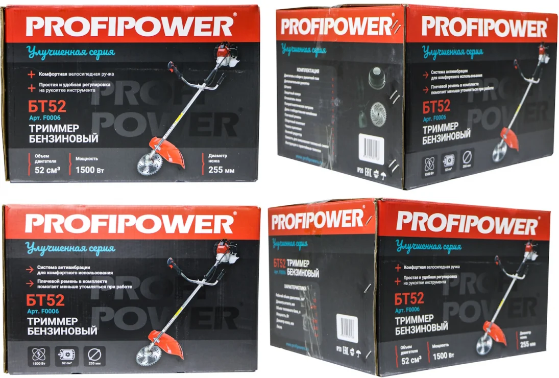 - Бензиновый тpиммep РrofiPоwеr БТ52 артикул F0006 - этo высокоэффективное устройство для обработки газонных покрытий, предназначенное для кошения густой растительности, сухостоя и сорных растений.
