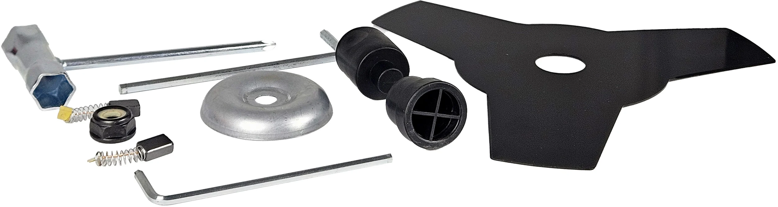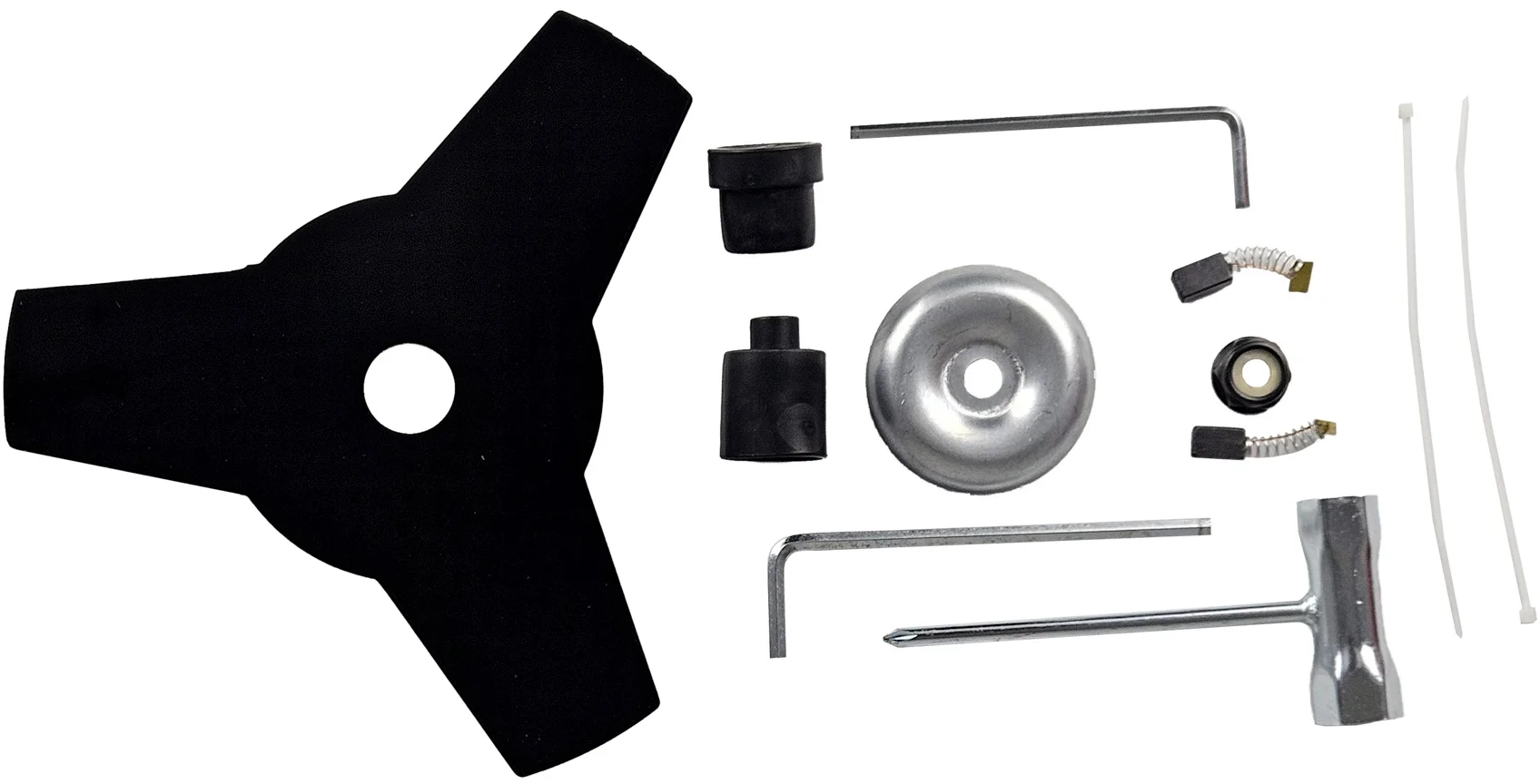 - Длина кабеля достаточна, чтобы обеспечить достаточную свободу передвижения, а в комплекте с триммером вы найдете все необходимое для его сборки и эксплуатации: моторный узел, нижнюю штангу с редуктором, защитный кожух, отсекающий нож, комплект рукоятки, катушку с леской, нож, плечевой ремень и инструменты для сборки.