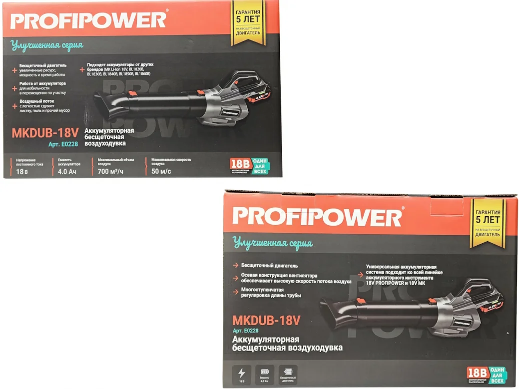 Аккумуляторная бесщеточная воздуходувка PROFIPOWER MKDUB-18V (Li-ion-1шт, 18В, 4.0Ач, З/У, в коробке), E0228
