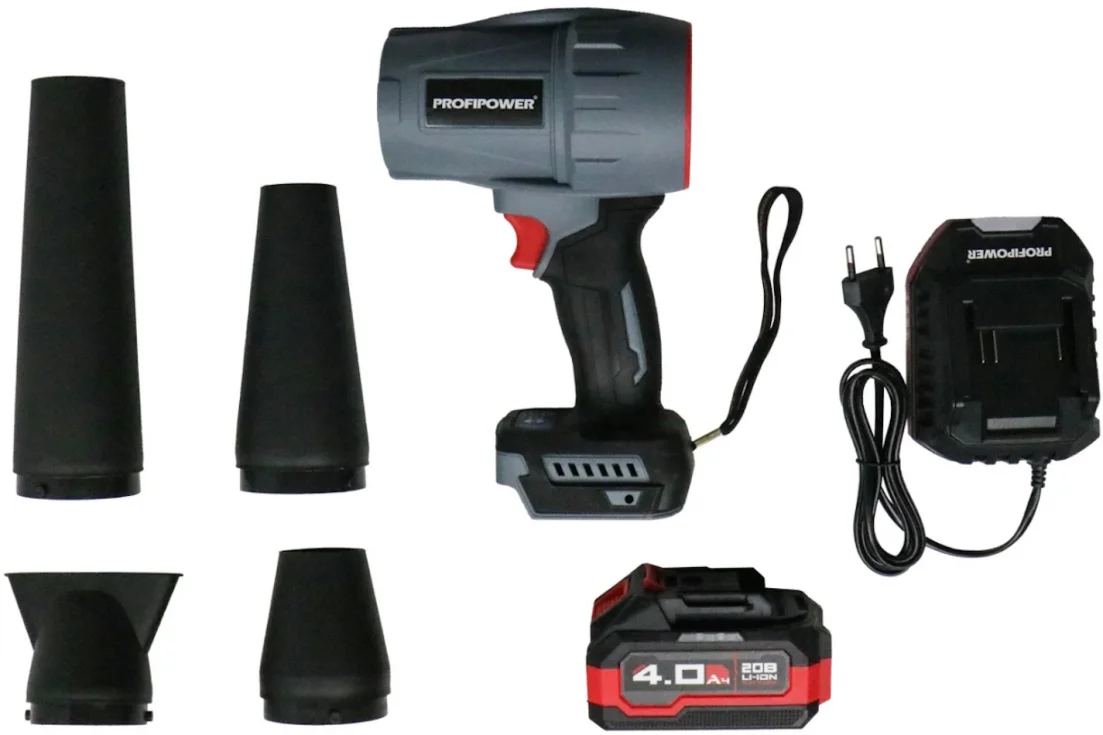 Аккумуляторная бесщеточная воздуходувка PROFIPOWER "Tornado" MKBUB-20V (20В, Li-ion-1шт, 4.0Ач, З/У, с насадками, в коробке), E0225